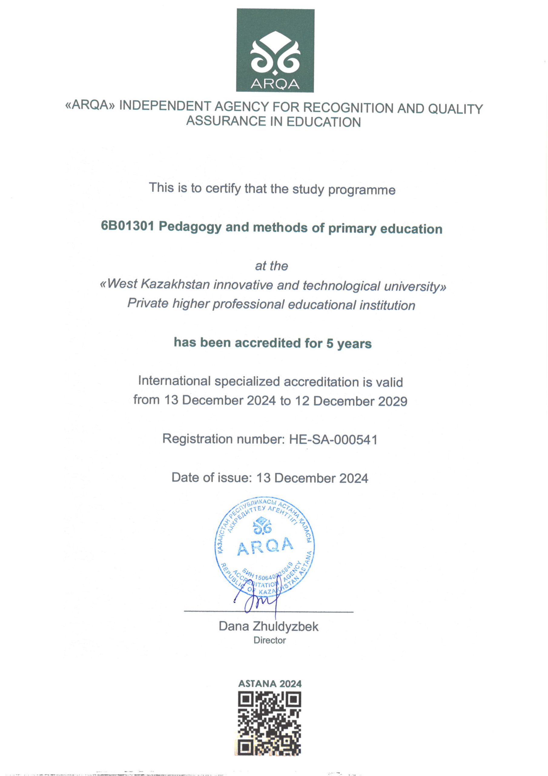 By the decision of the ARQA Accreditation Council dated 11.12.2024, the West Kazakhstan Innovational and Technological University was accredited for 7 years.