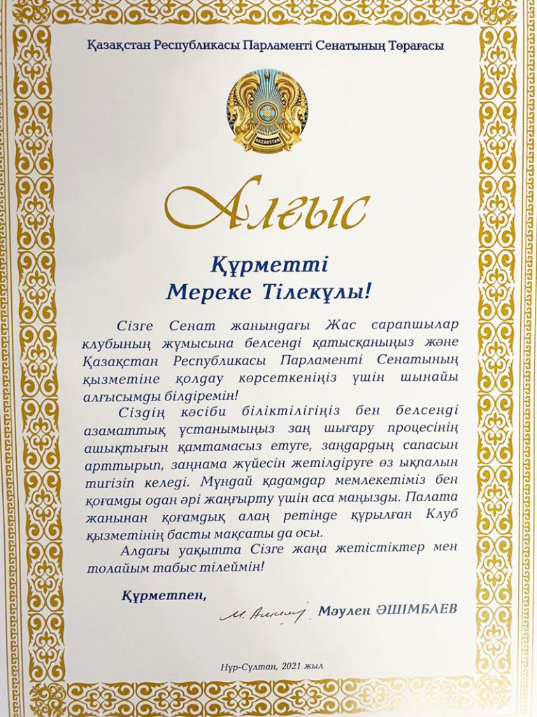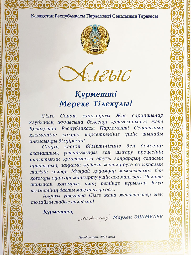On the 8th of November, the candidate of Legal Sciences, senior lecturer of the Department of Humanities and Legal Disciplines Gabdualiev Mereke Tlekovich received a letter of Thanks from the Speaker of the Senate of the Parliament of the Republic of Kazakhstan Maulen Sagatkhanuly Ashimbayev for his contribution to the development of the Club of Young Experts at the Senate of the Parliament and expert-analytical work in the legislative sphere.
