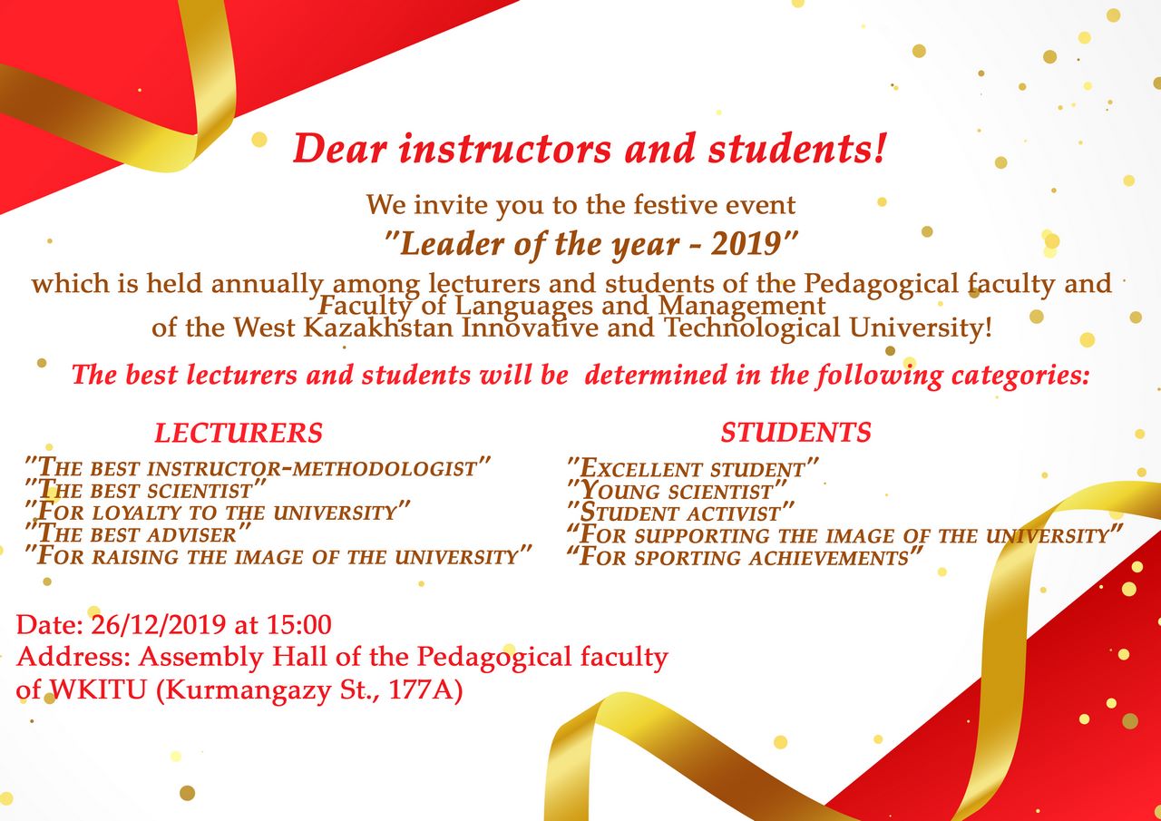 We invite you to the festive event “Leader of the year – 2019”, which is held annually among lecturers and students of the Pedagogical faculty and Faculty of Languages and Management of the West Kazakhstan Innovative and Technological University!