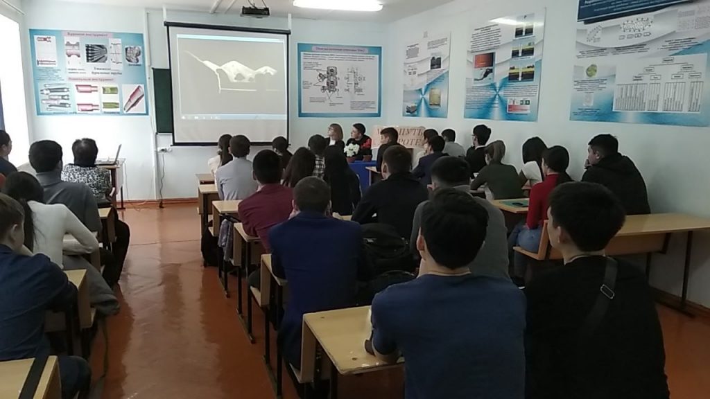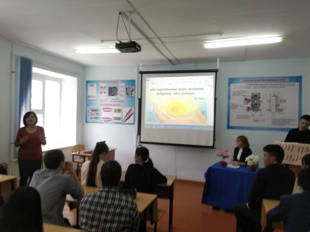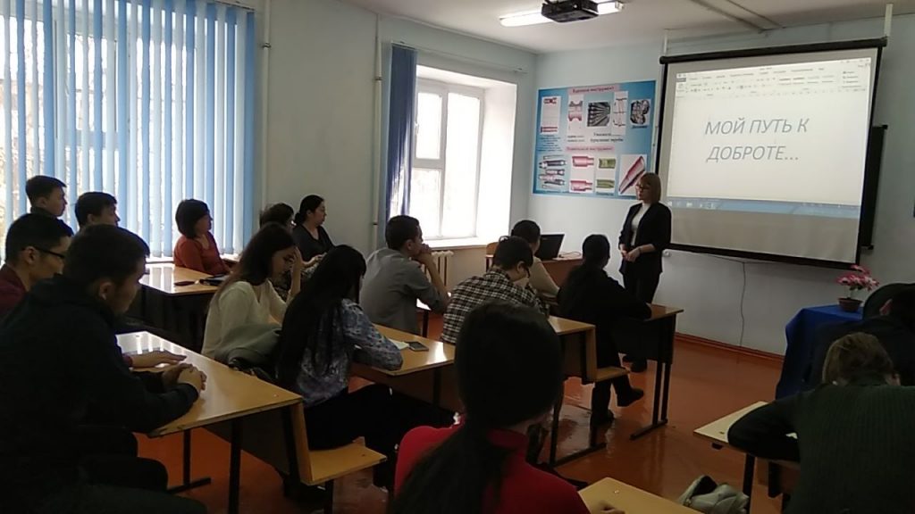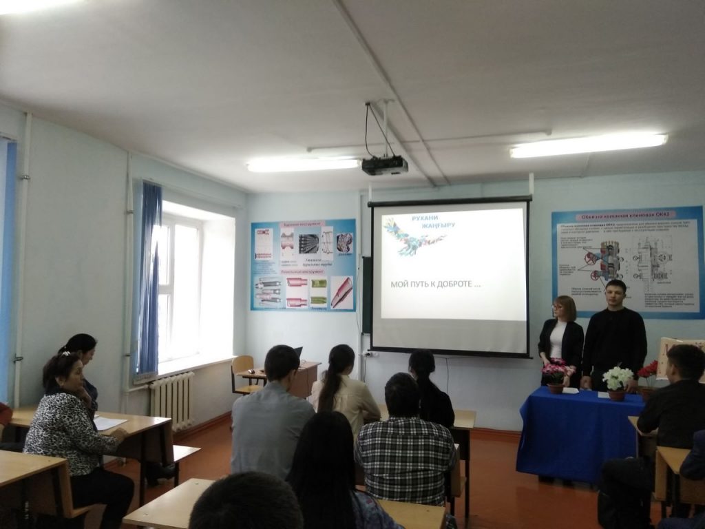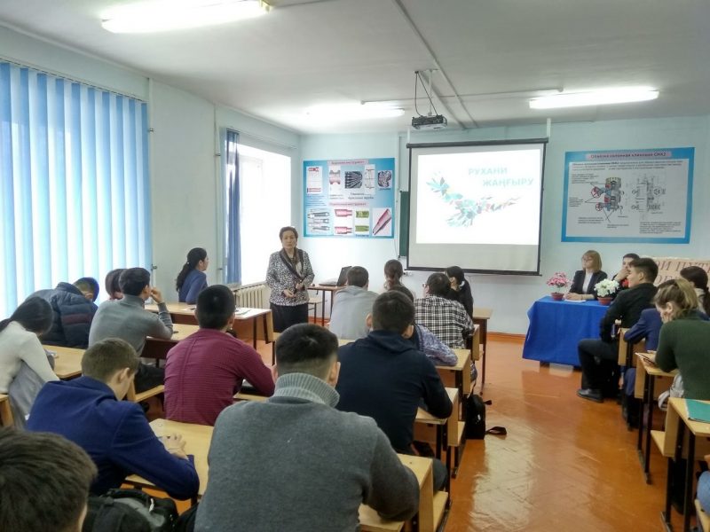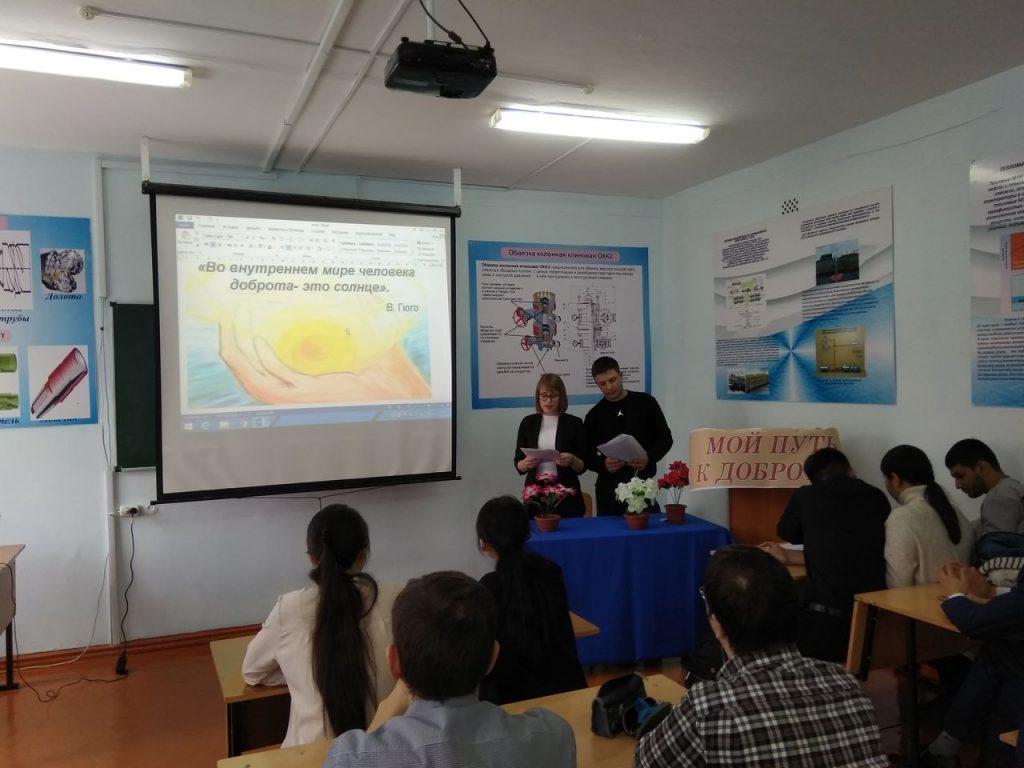 On 11 March, 2019 in order to implementation the program “Ruhani zhangyru” – “Looking into the future: modernization of public awareness” at the engineering-technological faculty of WKITU, a literary evening was held on the theme «My way to kindness…. ». Teachers of the public educational department involved students of 1-2 courses of the faculty. The poems of modern authors about kindness and mercy were read, a conversation was held about the spiritual values of man. Videos were shown prepared by students.