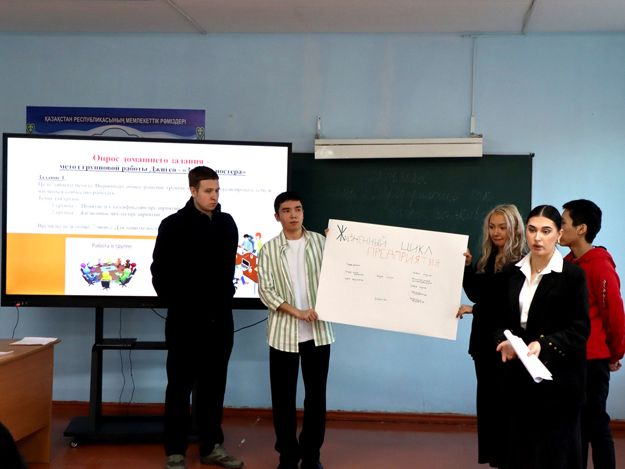 In the practical lesson, the main tasks and functions of an existing enterprise and their classification, the stages of the life cycle of the enterprise are revealed. The teacher used the following active teaching methods: Jigsaw teamwork method – “Poster protection”, “Brainstorming”, CLIL technology. In order to monitor and evaluate students ‘ knowledge, the teacher used the programs “Word wall”, “TARSIA”, various task cards and interactive exercises.