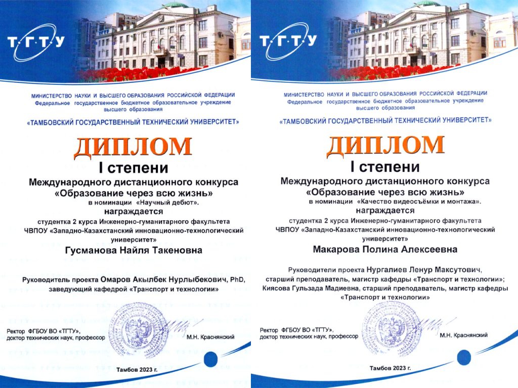 Congratulations to the 2nd year students Gusmanova Nailya studying under the educational program 6B07101 – Transport, transport equipment and technology and Makarova Polina studying under the educational program 6B11301 – Organization of transportation, traffic and operation of transport with diplomas of the 1st degree for participation in the international distance competition in engineering areas «Education through life» in the nomination «Scientific debut» and «The quality of video shooting and editing», respectively, held in the city of Tambov of the Russian Federation from March 27 to April 05, 2023.