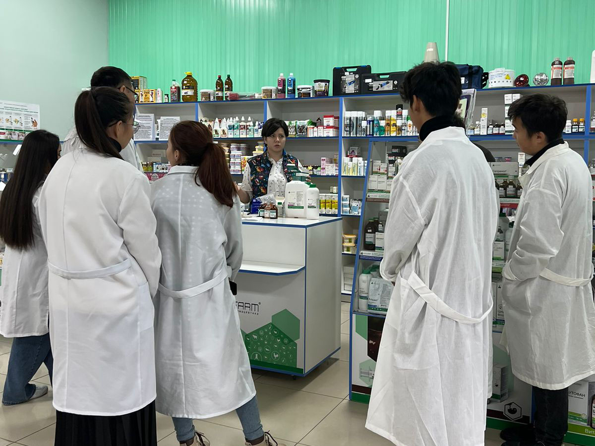 Professor of the Department of Veterinary Medicine and Technosphere Safety, Doctor of Biological Sciences Kanatbayev Serik Ganievich organized an introductory tour to 2nd-year undergraduates of the MVMN-21 group and 3rd-year students of the Vet-31O group with the ZOO MARKET veterinary pharmacy. The ZOO MARKET veterinary pharmacy is currently built according to a standard project in the city of Uralsk and is an institution that fully provides the necessary medicines and equipment for farm animals and pets. During the tour, the students got acquainted with the work of the veterinary pharmacy, various medicines, vaccines, solutions for disinfection of livestock premises and surgical instruments. In addition, the veterinary pharmacy received specific information about the rules for storing various medicines and the requirements for their transportation.