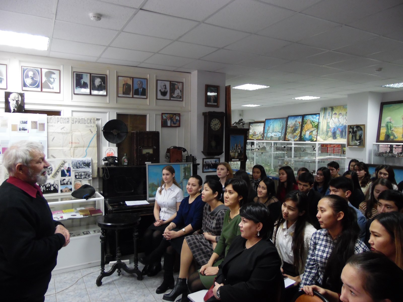 The guest of the evening Alexander Petrovich told about the uniqueness of our region, about the friendship and creation of the peoples living in the territory of the Ural river. Students read the poems of Moldagaliev Zh., Shakhanov M., Balashov S., Kabanova A. and other authors on the theme of the Ural river area.