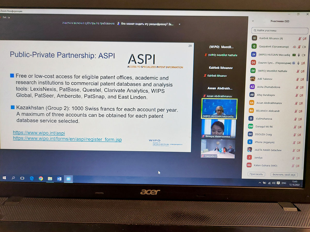 On October 12, 2022, an online webinar was held on the development of the national network of Technology and Innovation Support Centers (CTI) in Kazakhstan organized by the World Intellectual Property Organization (WIPO) in cooperation with the RSE “National Institute of Intellectual Property” of the Ministry of Justice of the Republic of Kazakhstan and KAZPATENT.