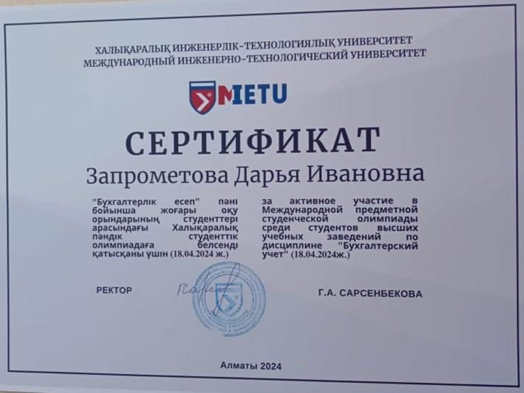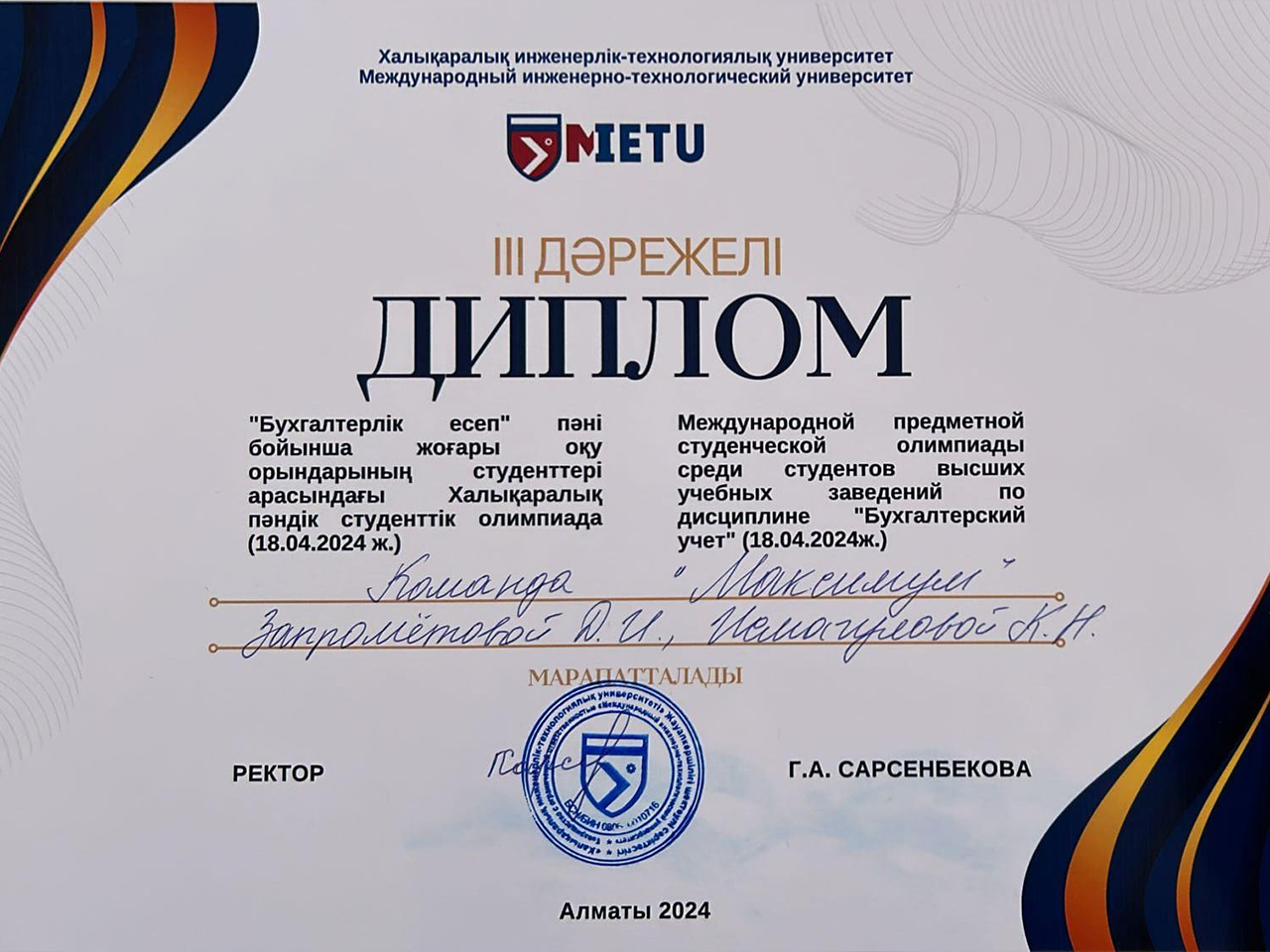 In the international student subject Olympiad in the discipline “Accounting” among students of 1,2,3 courses of universities in the educational program “Accounting and Auditing”, conducted by the International University of Engineering and Technology in Almaty, 2nd year students of group UA-221 of the department “Finance and Economics” Zaprometova D.I., Ismagulova K.N. won the 3rd place and were awarded 3rd degree diplomas. Supervisors – senior lecturers Umarova N.S. and Aimesheva Zh.A.