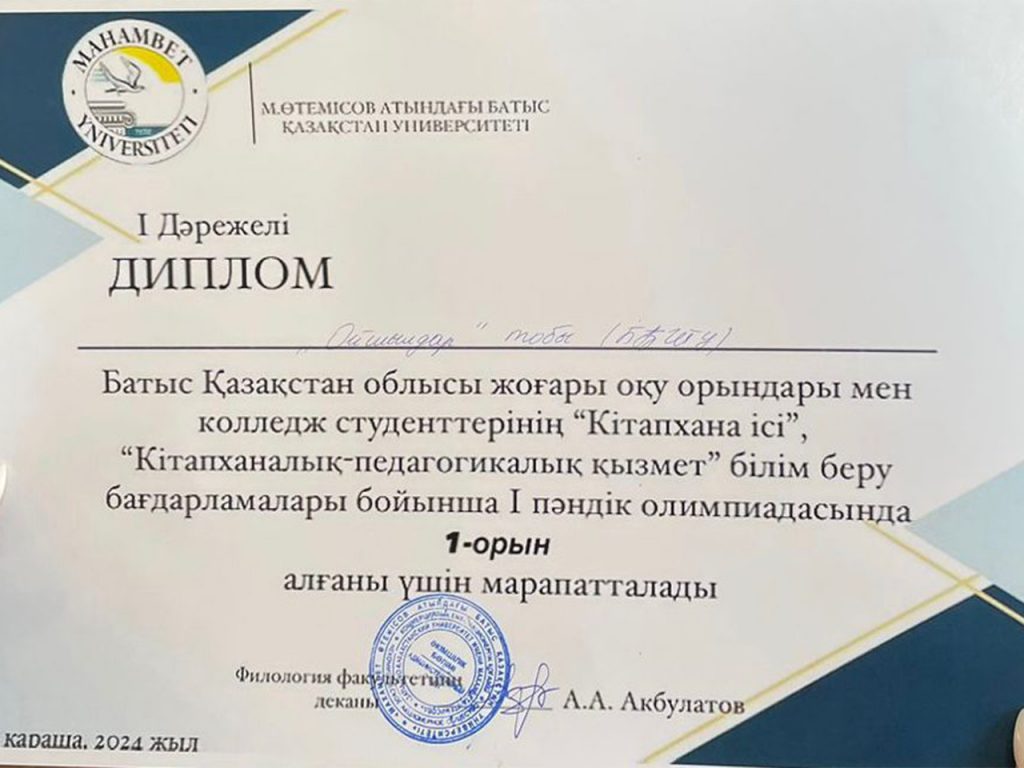 On November 1, 2024, the 1-st subject Olympiad was held at the West Kazakhstan University named after Makhambet Utemisov in the direction of training in educational programs 6B03201 – “Library Science”, 6B03207 – “Library and Pedagogical Activity” among students of higher educational institutions and colleges.
