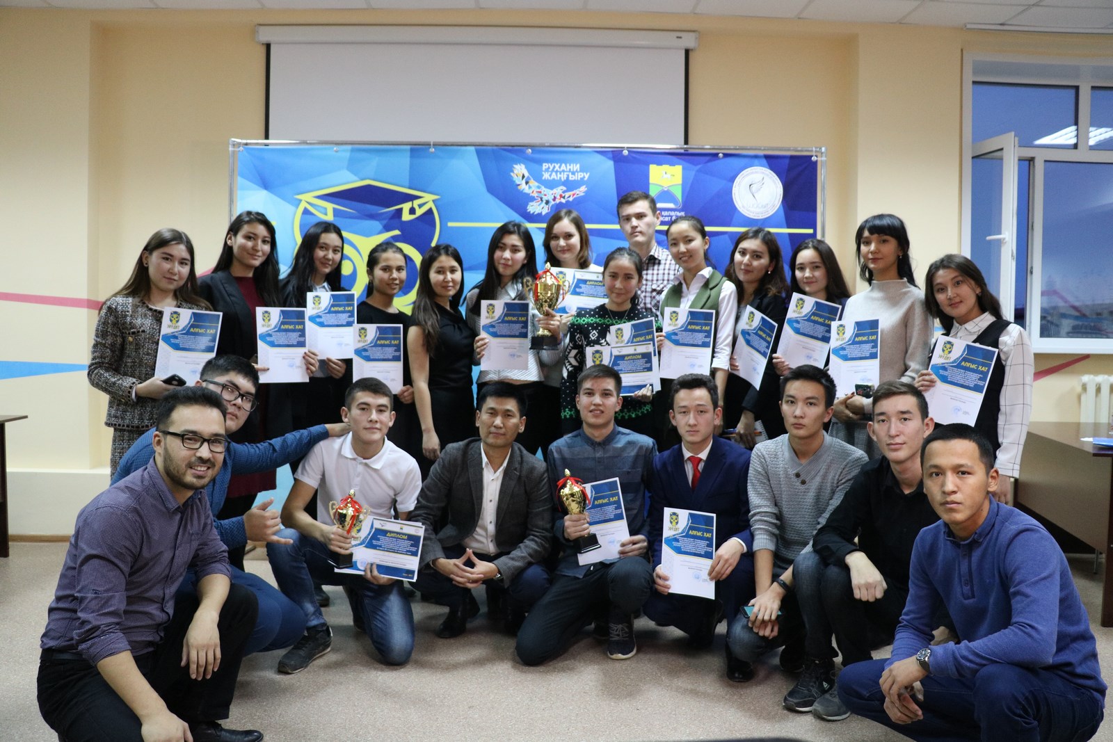 November 2, 2017 Public Association “Center for creative initiatives” Shabyt “with the support of the Department of internal policy of Uralsk organized and conducted an intellectual contest “Erudite “among students of universities and colleges. The main goal of this event is the propaganda and support of the program of the head of state Nazarbayev N.A. “Rukhani zhangyru.” The intellectual competition consisted of two rounds: according to the results of the competition, students of our university, who took part in two teams, Zhastіlek Nadia- 3rd year student of the specialty “History “, Zhamanbayeva Onaisha – 2nd year student of the specialty” Kazakh language and literature “(“Smile” team), Rakhymgaliev Samat – 2nd year student of the specialty” Life safety and environmental protection “, Issayeva Nargiza – 1 year student of the specialty” Life safety and protection of the environment “( “Hypotenuse” team) became the winners of the intellectual game.