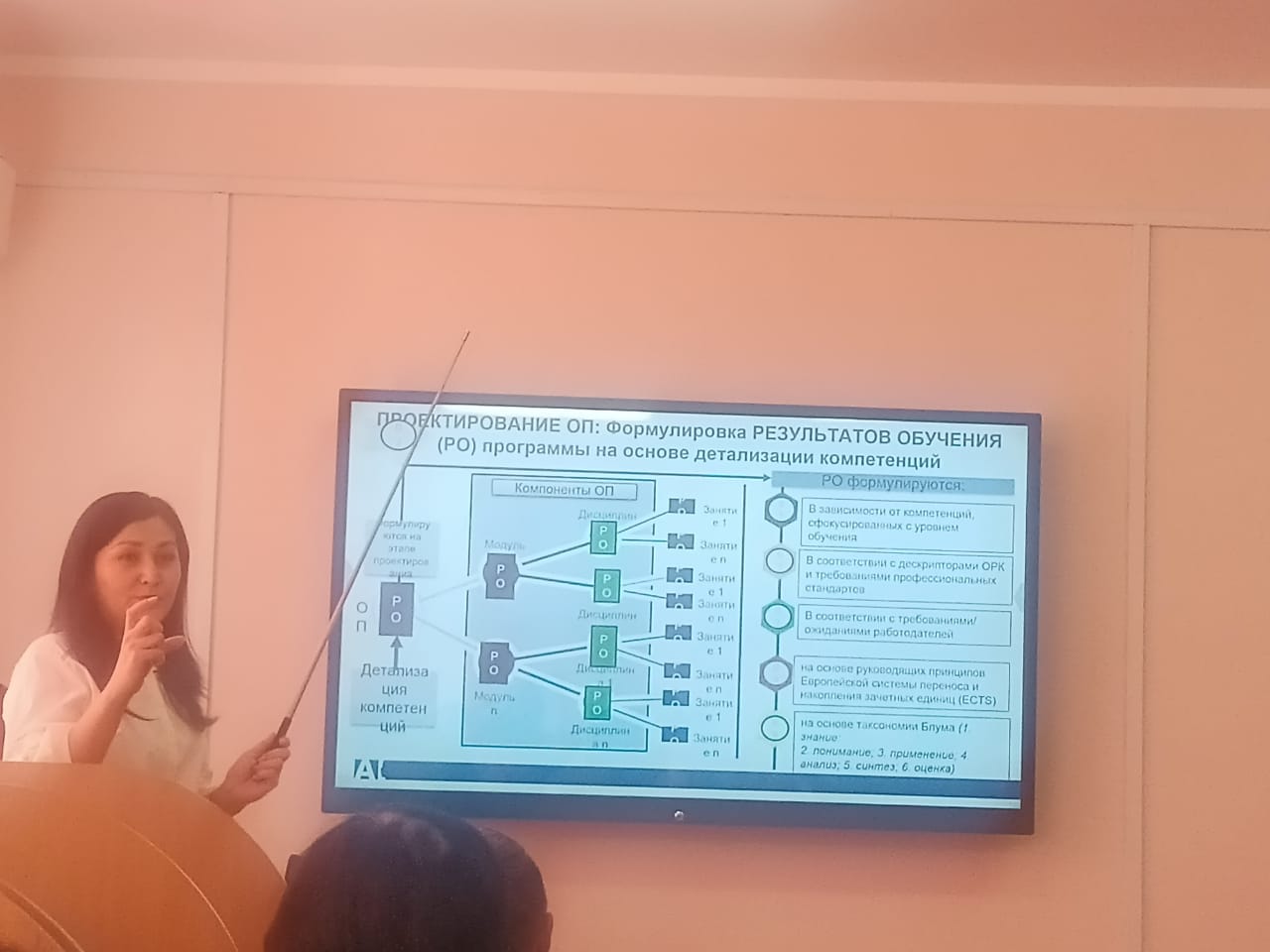 Head of the Department for Academic Activities Mashanova S.A. made a presentation “Structure, principles and stages of development of educational programs”, head of the department of educational planning Aitmukanova G.M. dwelled in detail on the mechanisms of formation of learning outcomes in the report “Bilim beru bagdarlamalarynda oku natizhelerin kalyptastyru”.