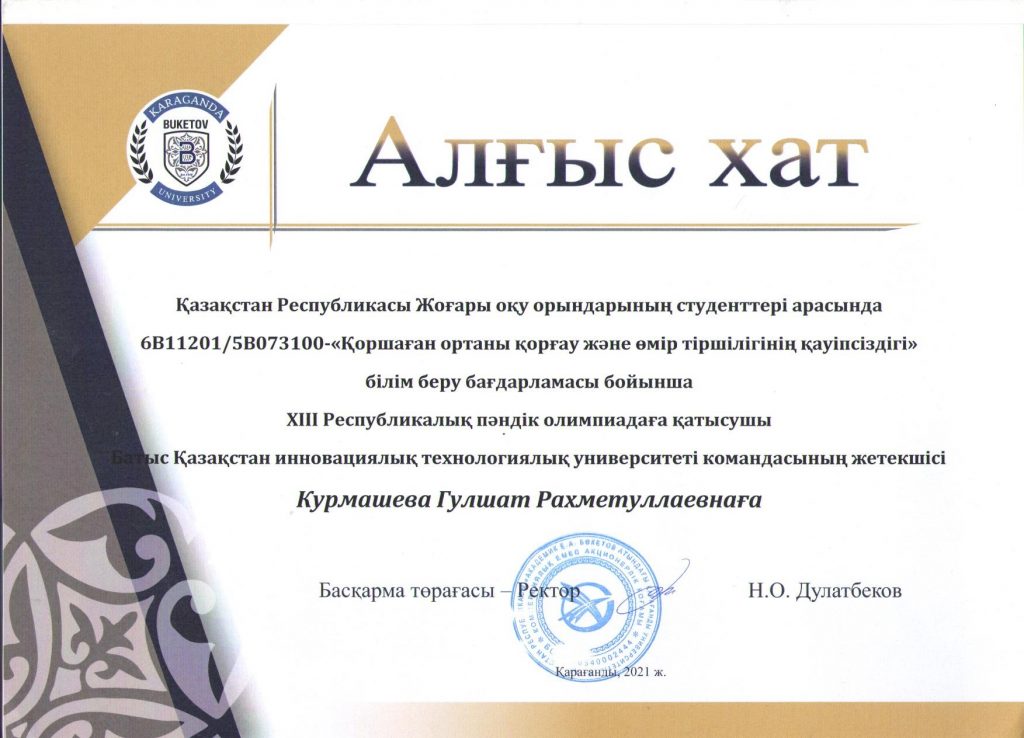 On the 12 of April, 2021 student of the specialty “Life and Environmental Safety” Nikolay Prokazov group BZhD-32 took part in the XIII Republican Subject Olympiad and took the prize the II place.