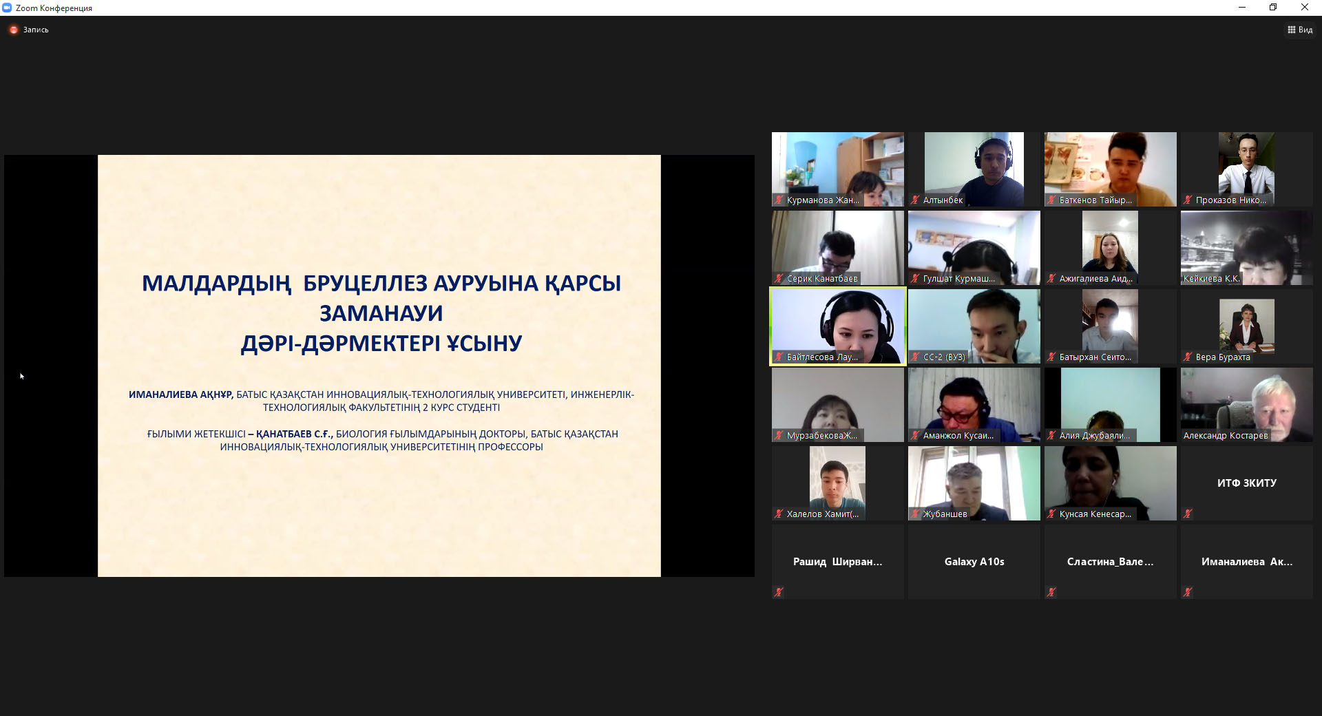 There were 39 reports of students, Master Degree students, postgraduates of West Kazakhstan Innovation and Technology University., as well as universities of the Republic of Kazakhstan and the Russian Federation: West Kazakhstan State University named after M. Utemisov, West Kazakhstan Agrarian Technical University named after Zhangir Khan, Kalmyk State University named after B. B. Gorodovikov, Saratov State Technical University named after Yu. A.Gagarin, Orenburg State Agrarian University, Ulyanovsk State Agrarian University named after P. A. Stolypin were submitted for participation in the section. During the online conference, the scientific reports of young scientists addressed the current problems of ecology, biology, life safety and environmental protection, veterinary medicine. At the end of the conference, the results were summed up, the winners were awarded, certificates were awarded to Master Degree students, postgraduates – participants of the conference from universities of the Republic of Kazakhstan and the Russian Federation, letters of thanks to scientific supervisors.