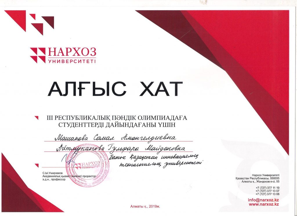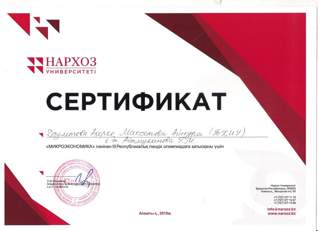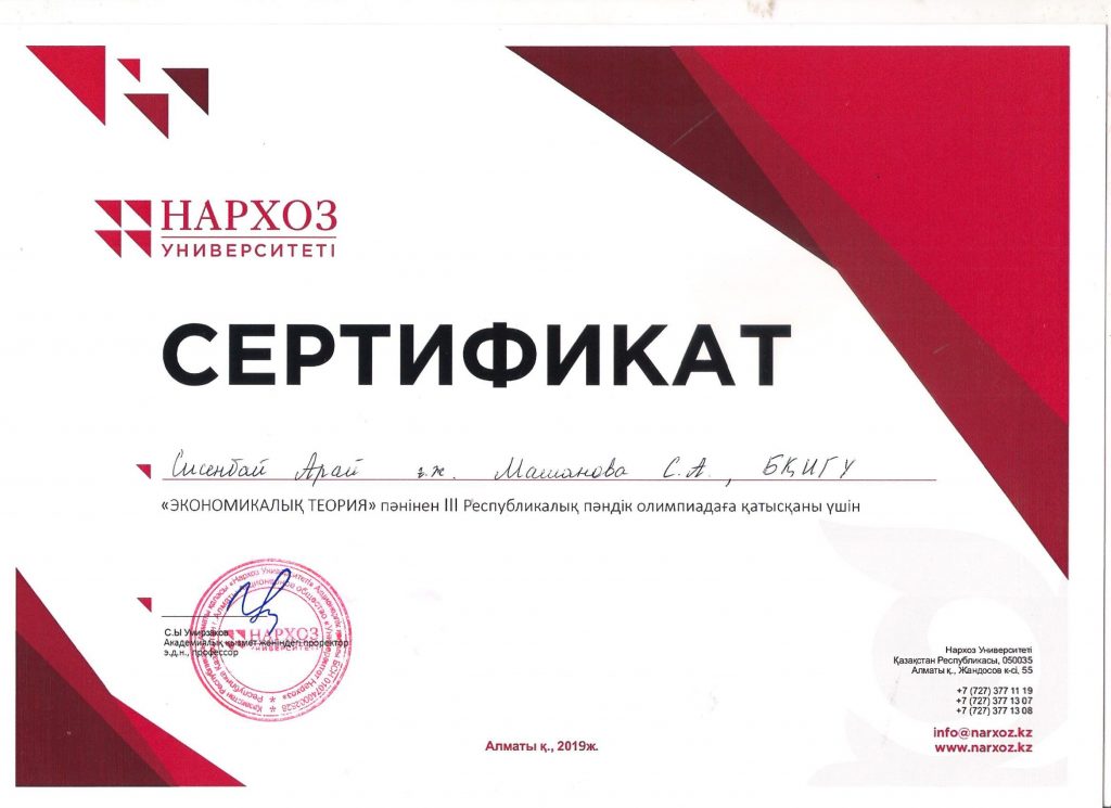 Студент Сисенбай Арай «Экономикалық теория» пәнінен, Дәулетова Ақерке «Микроэкономика» пәнінен ІІІ Республикалық пәндік олимпиадаға қатысқаны үшін сертификатпен марапатталса, студенттерді дайындағаны үшін аға оқытушылар С.А.Машанова мен Г.М. Айтмуканова алғыс хатқа ие болды.
