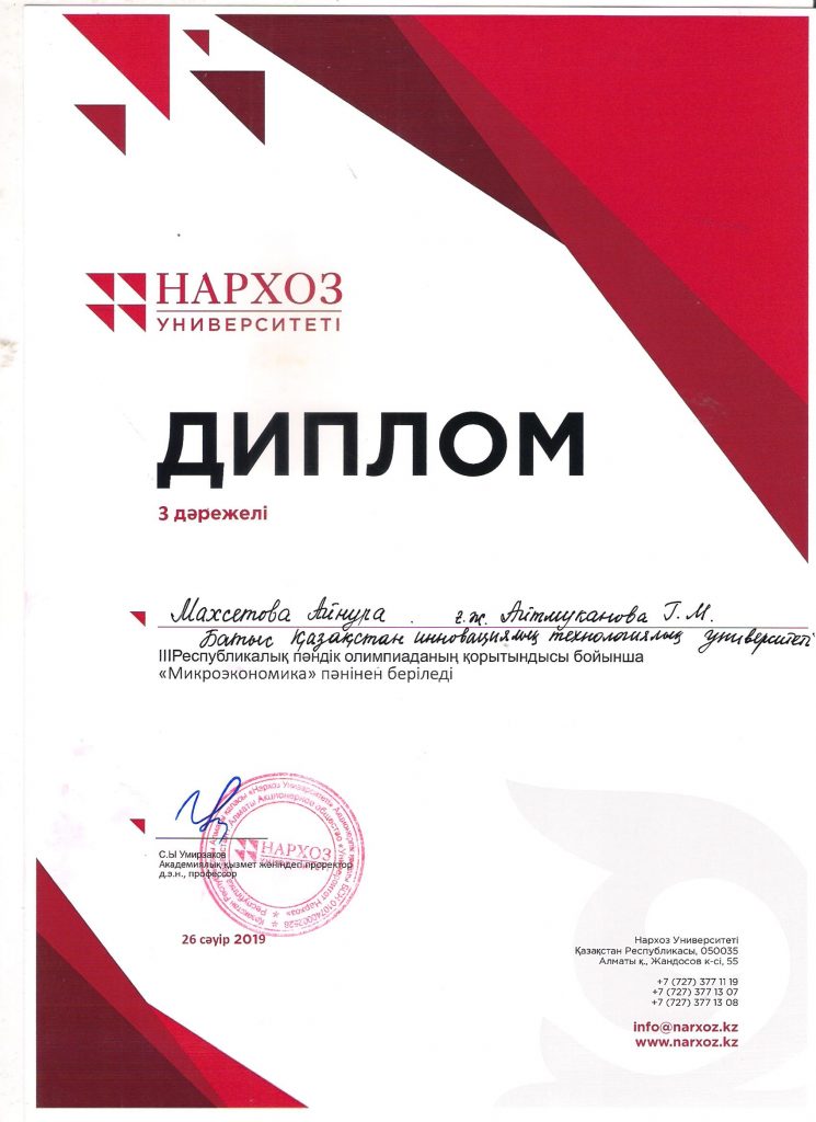 «Микроэкономика» пәнінен барлық турдың қорытындысы бойынша 5В050900 – «Қаржы» мамандығының 1 курс студенті Махсетова Айнура жоғары балл жинап, жүлделі 3-ші орынды иеленіп, дипломмен марапатталды.