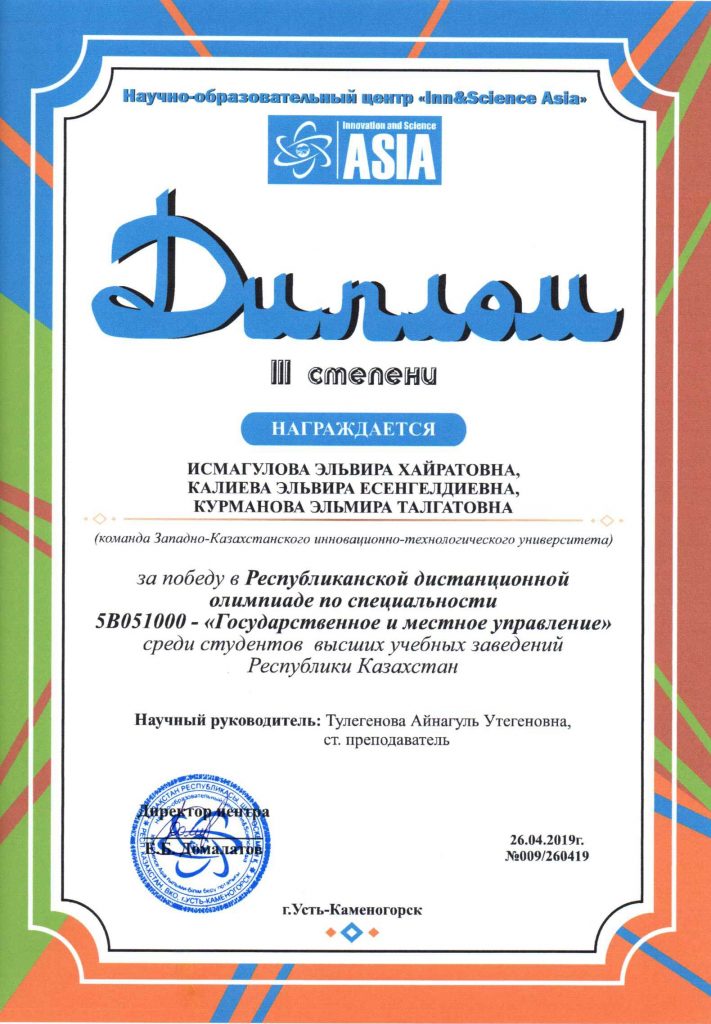 Өскемен қ. «Inn & Science Asia» ғылыми-білім беру орталығы 5B051000 – «Мемлекеттік және жергілікті басқару» және 5В050700 – «Менеджмент» мамандықтарының студенттері арасында Республикалық қашықтықтан Олимпиада өткізді.