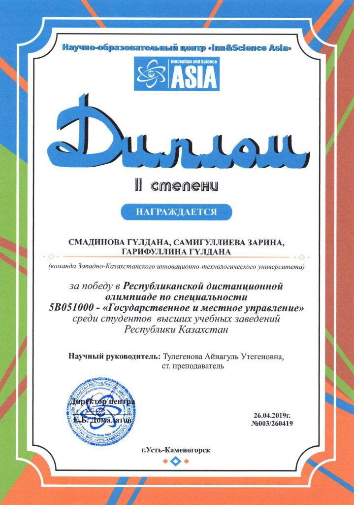 Республикалық қашықтықтан Олимпиада қорытындысы бойынша 5В051000 «Мемлекеттік және жергілікті басқару» мамандығының 1 курс студенттері Смадинова Гүлдана, Самигуллиева Зарина, Гарифуллина Гүлдана 2 орын алды;