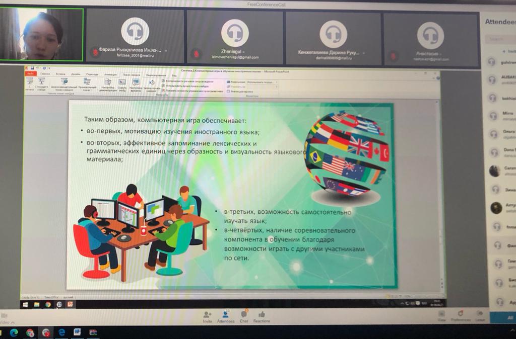 Конференция FreeConferenceCall платформасы арқылы онлайн-режимде ұйымдастырылды. Конференция бағдарламасына түрлі тақырыптарға байланысты 32 баяндама енгізілді, оның 7 қазақ, 18 орыс, 7 ағылшын тілінде. Аталған секцияның жұмысына Батыс Қазақстан инновациялық-технологиялық университетінің, Орынбор мемлекеттік педагогикалық университетінің, Көлік және логистика академиясының, Х.Досмұхамбетов атындағы Атырау университетінің, М.Өтемісов атындағы Батыс Қазақстан университетінің студенттері мен магистранттары қатысты. Конференция барысында шет тілдерін оқытудағы заманауи технологиялар, қашықтықтан оқыту, аударманы оқытудағы инновациялық тәсілдер мәселелері сөз болды. Баяндамалардың барлығы презентацияланды. Жұмыс нәтижелері конференция материалдарының жинағы болып жарияланады.