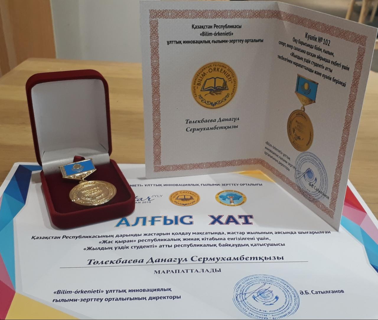 Республикалық олимпиадаларға, конференцияларға, жобаларға, байқауларға белсенді қатысқаны үшін «Жас қыран» республикалық талантты жастардың кітап жинағына енді.