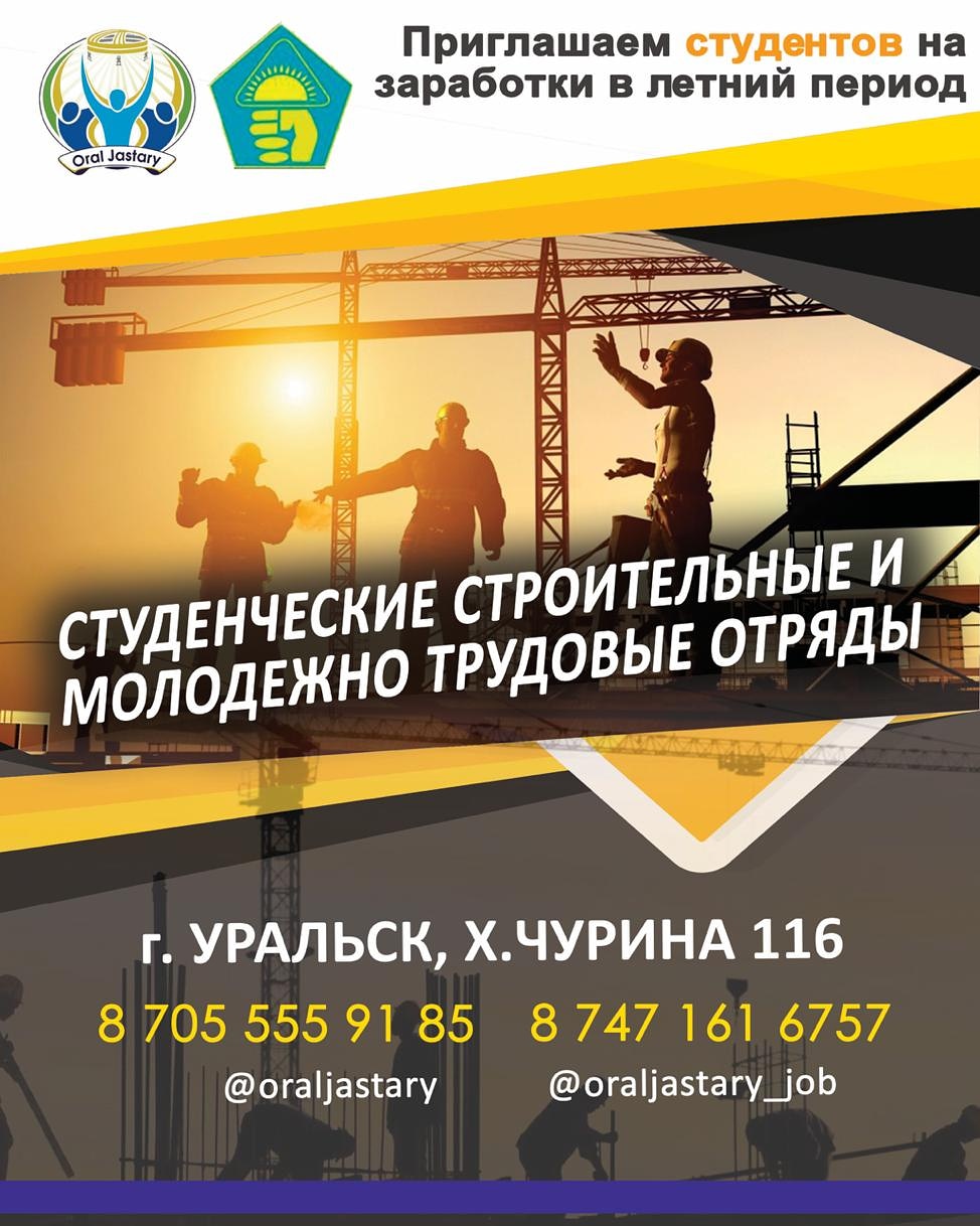 Осыған орай қаламыздың құрылыс нысандарында «Студенттік құрылыс жасақтары» бағдарламасы аясында Батыс Қазақстан инновациялық-технологиялық университетінің студенттері маусымдық жұмысқа орналасуға ниет білдірсе (18 жасқа толған) өтініштеріңізді топ эдвайзерлер арқылы 2020 жылдың мамыр айының 25 жұлдызына дейін жіберуіңіз сұралады.
