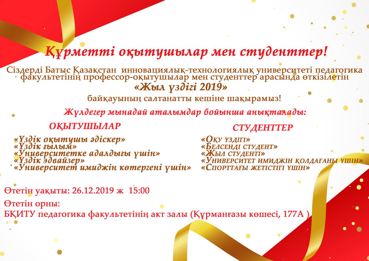 Сіздерді Батыс Қазақстан инновациялық-технологиялық университеті педагогика факультетінің профессор-оқытушылар мен студенттер арасында өткізілетін «Жыл үздігі 2019» байқауының салтанатты кешіне шақырамыз! Post navigation ҚР Білім және ғылым министрлігінің ресми Telegram-каналы Абайлаңыз Коронавирус