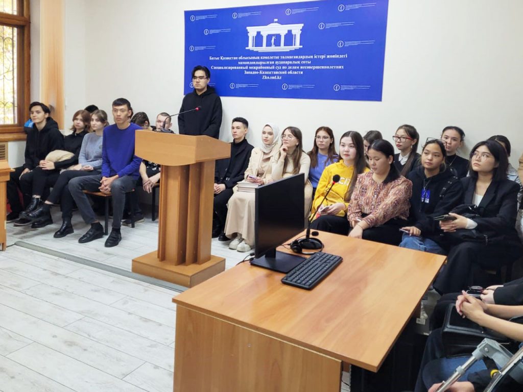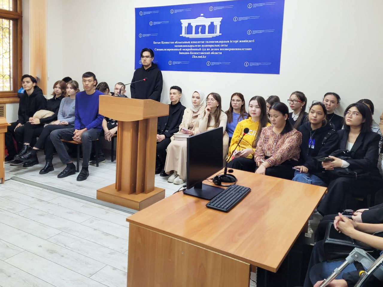 БҚО кәмелетке толмағандардың істер жөніндегі мамандандырылған ауданаралық сотының кеңсе менгерушісі Ж.Утегенова студенттерге сот жүйесінде колданылатын акпараттық технологиялармен, автоматтандырылған ақпараттық жүйе және «Төрелік» бағдарласымен калай жұмыс жасау керектігі туралы айтып өтті, Тындаушылардың ерекше назарын сот отырысын откізу барысында тараптармен байланыс орнату үшін колданылатын «TrueCont» багдарламасы қызықтырды.