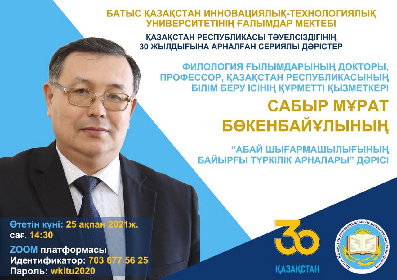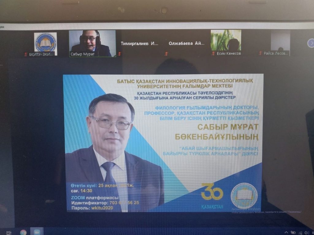 2021 жылдың 25 ақпан күні Батыс Қазақстан инновациялық – технологиялық университетінің «Тарих және құқық» кафедрасының ұйымдастыруымен Қазақстан Республикасының Тәуелсіздігінің 30 жылдығына арналған дәрістер сериясы аясында ф.ғ.д., профессор М.Б.Сабыр «Абай шығармашылығының байырғы түркілік арналары» атты дәріс оқыды. Дәріс ZOOM форматында өткізілді. Дәріске 100-ге жуық тыңдарман қатысты.
