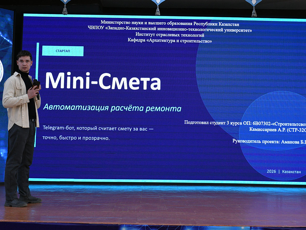 2026 жылғы 2–9 сәуір аралығында Батыс Қазақстан инновациялық-технологиялық университетінің Салалық технологиялар институты Ғылым қызметкерлері күніне орай «AI Start up» жастар стартап-жобалары байқауын ұйымдастырды.