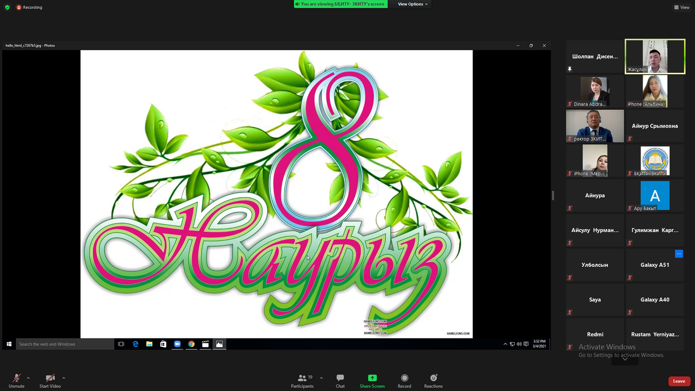 2021 жылдың 4 наурыз күні «Тілдер және менеджмент» факультетінің «Есеп және қаржы» кафедрасының студенттерімен «Ана – тіршілік тірегі» тақырыбындаонлайн форматта мерекелік шара ұйымдастырылды.Студенттер кафедра оқытушылар құрамын және аналарын құттықтап өз өнерлерін көрсетті.