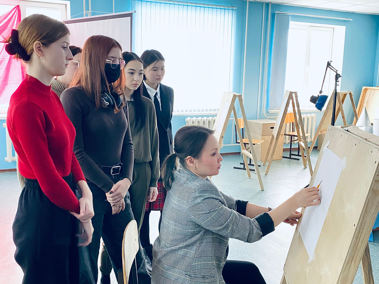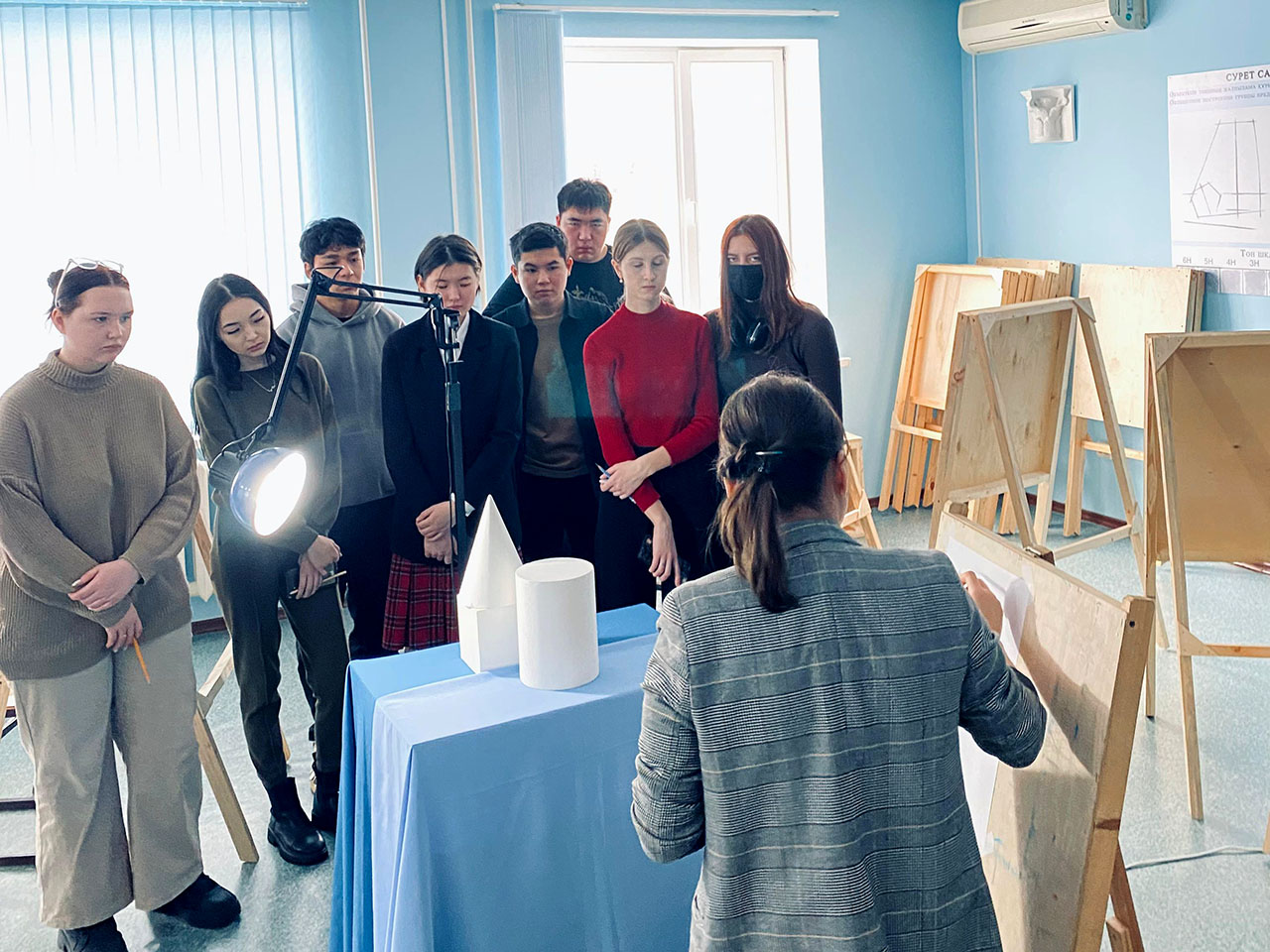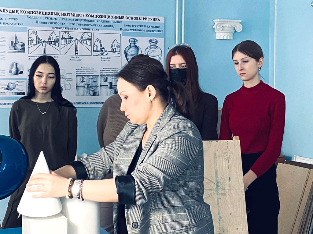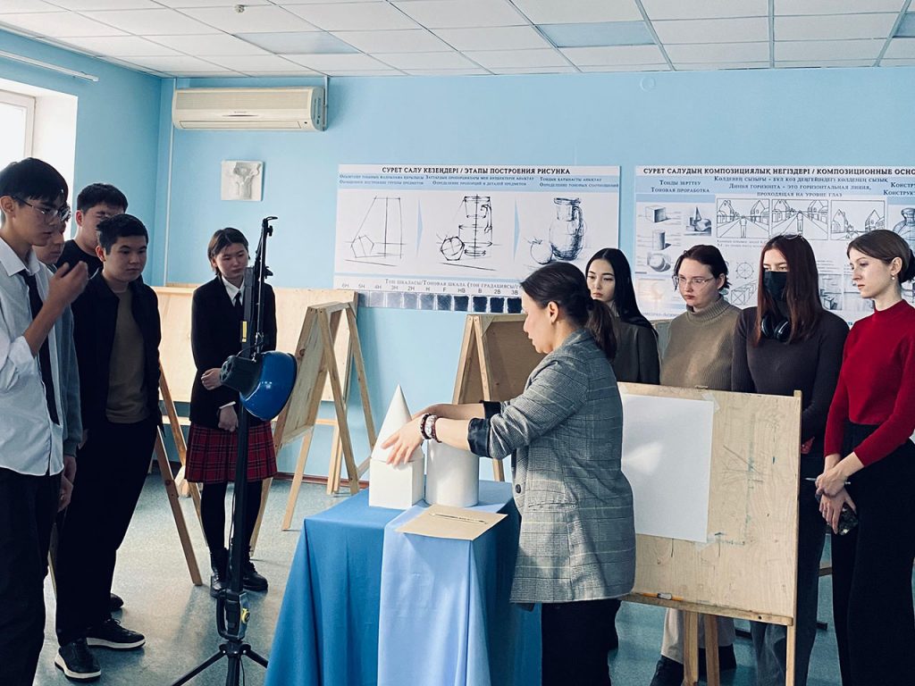 2024 жылдың 7 ақпанында «Сәулет және құрылыс» кафедрасында» аға оқытушы Кенжина Ж.С. AРХ -12 тобында «Сурет» пәнінен «Геометриялық фигуралар/денелер композициясының конструктивті – сызықтық суреті» тақырыбында ашық практикалық сабақ өткізді.