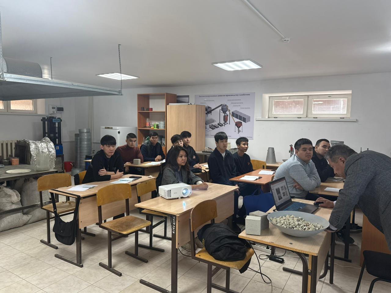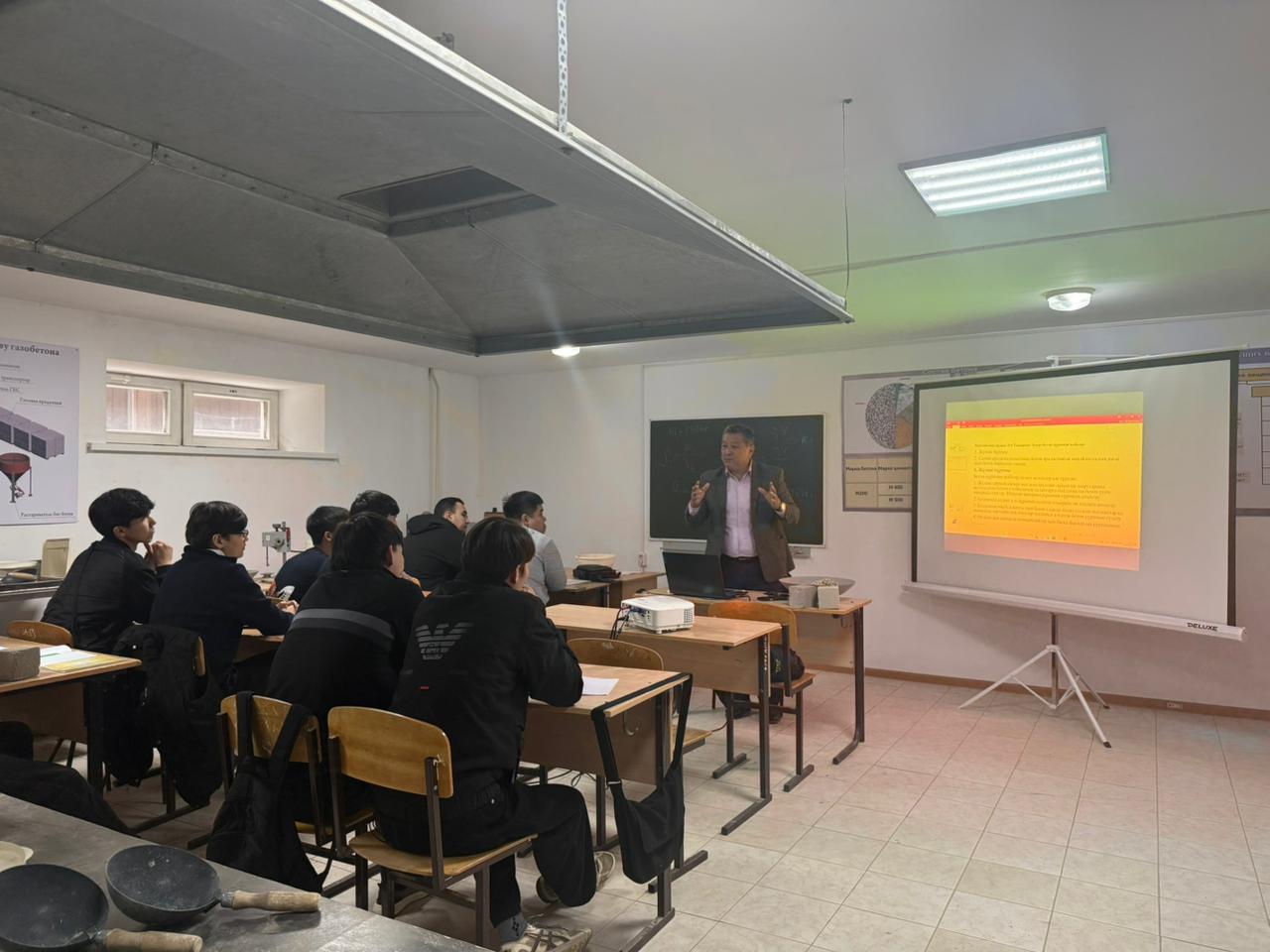 2026 жылдың 24 сәуірі күні сағат 14.20-да 6B07301- «Сәулет және құрылыс» кафедрасының қауымдастырылған профессор м.а., техника ғылымдарының кандидаты К.А. Нариков АРХ-31О тобының студенттеріне «Ауыр бетонын жобалау» тақырыбында зерханалық ашық сабақ өткізді. Ашық зераналық сабақтың ерекшелігі оқытудың инновациялық әдістерін қолдана отырып, бетонның құрамын жобалаудың тәсілдері жасалды. Мақсаты – 1 м3 бетон құрамының көлемін есептеп үйрену . Сабақ барысында білім алушылар тақырыпты меңгеру мақсат бетонға қатысты сұрақтарға жауап беріп, бетонның жіктелуіне тоқталып, көлемін есептеп үйренді. Пән оқытушысы көрнекті құралдарды толық қолдана білді.