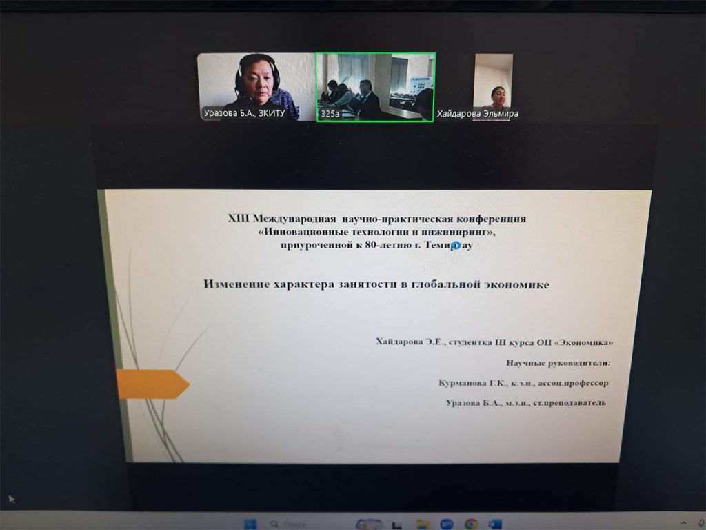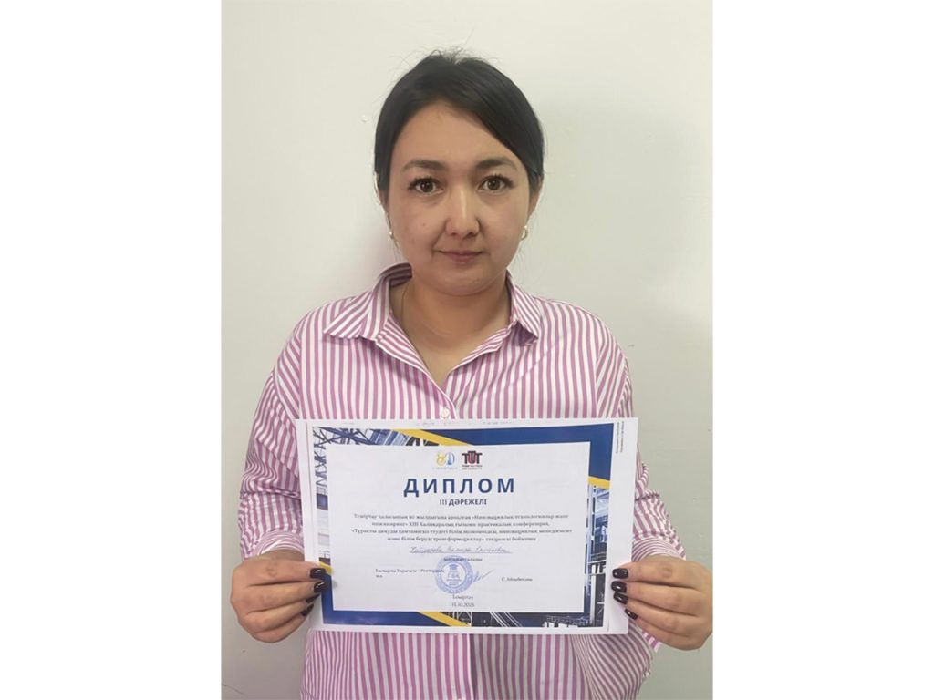 2025 жылғы 15-қазанда Теміртау қаласында Қарағанды индустриалды университетінің базасында Теміртау қаласының 80 жылдығына орай «Инновациялық технологиялар және инжиниринг» атты XIII Халықаралық ғылыми-практикалық конференция өткізілді. Конференция үш бағыт бойынша өтті. «Тұрақты даму қамтамасыз етудегі білім экономикасы, инновациялық менеджмент және білім беруді трансформациялау» секциясына «Жаһандық экономикадағы жұмыспен қамту сипатының өзгеруі» баяндамасымен «Экономика» білім беру бағдарламасының III курс студенті Хайдарова Эльмира қатысты. Сөз сөйлеу қорытындысы бойынша Хайдарова Эльмира III орын алып, III дәрежелі дипломмен марапатталды. Ғылыми жетекшілері – Құрманова Г.К., э.ғ.к., қауымдастырылған профессор және Уразова Б. А., э.ғ.м., аға оқытушы. Студентіміз бен ғылыми жетекшілерді жүлделі орындарымен құттықтаймыз!