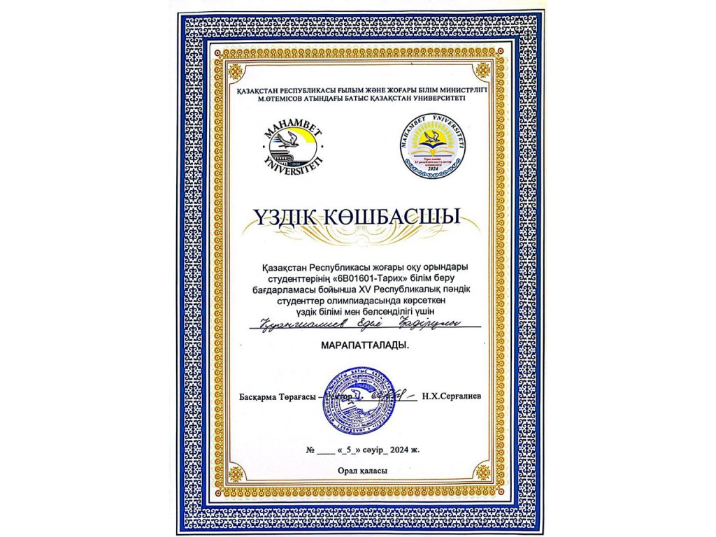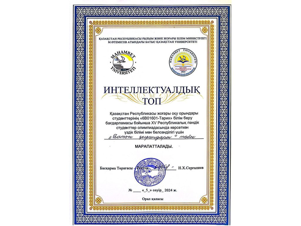 Батыс Қазақстан инновациялық-технологиялық университеті 6В01601-Тарих білім беру бағдарламасының «Батыс қырандары» командасы 2024 жылдың 4-5 сәуір күндері «ҚАЗАҚ ЕЛІ ТАРИХЫНДАҒЫ ЖОШЫ ҰЛЫСЫ: МӘНІ МЕН МАҢЫЗЫ» (ЖОШЫ ҰЛЫСЫНЫҢ ҚҰРЫЛҒАНЫНА 800 ТОЛУЫНА ОРАЙ) атты XV Республикалық студенттік пәндік олимпиадаға қатысты.