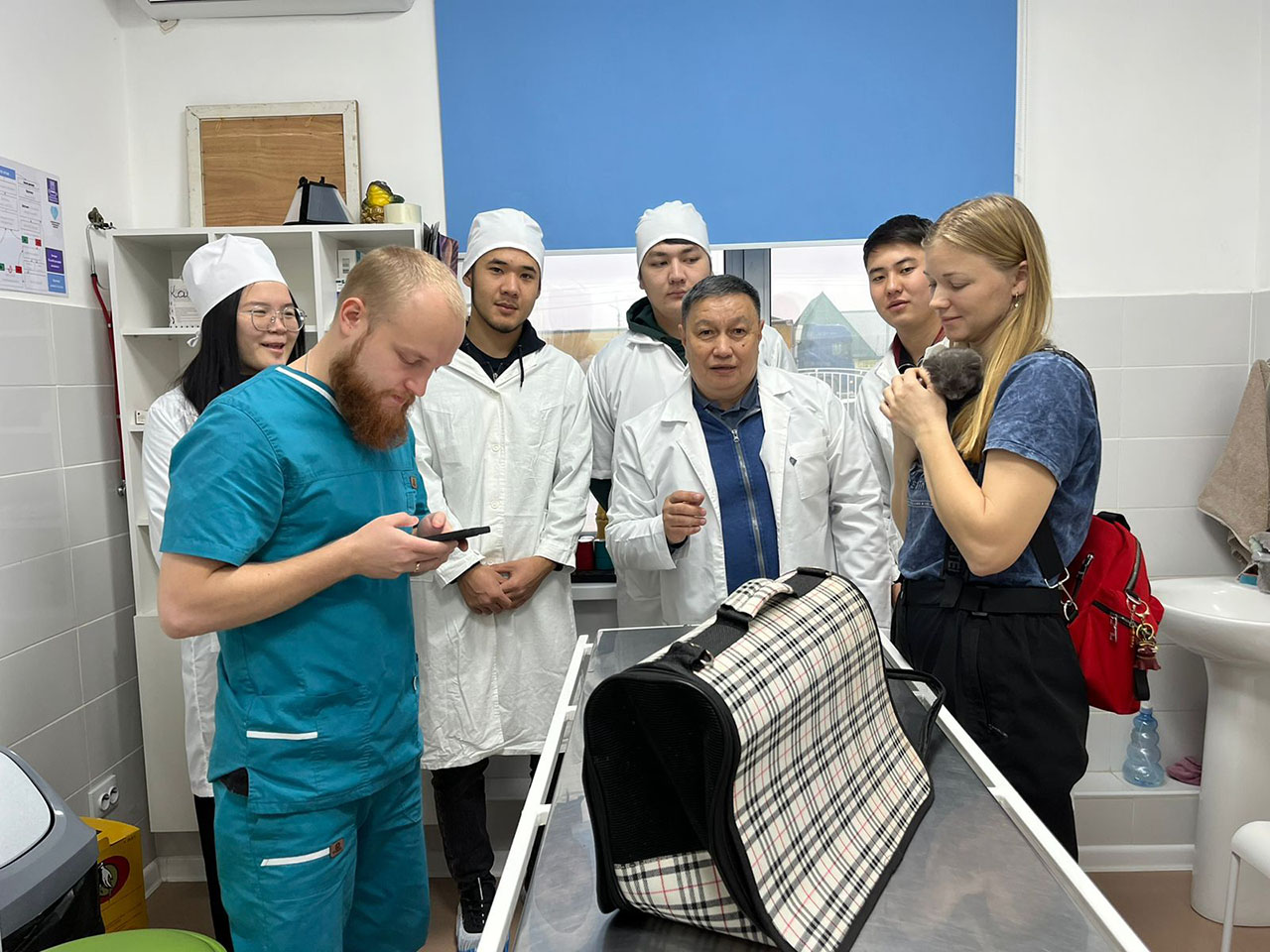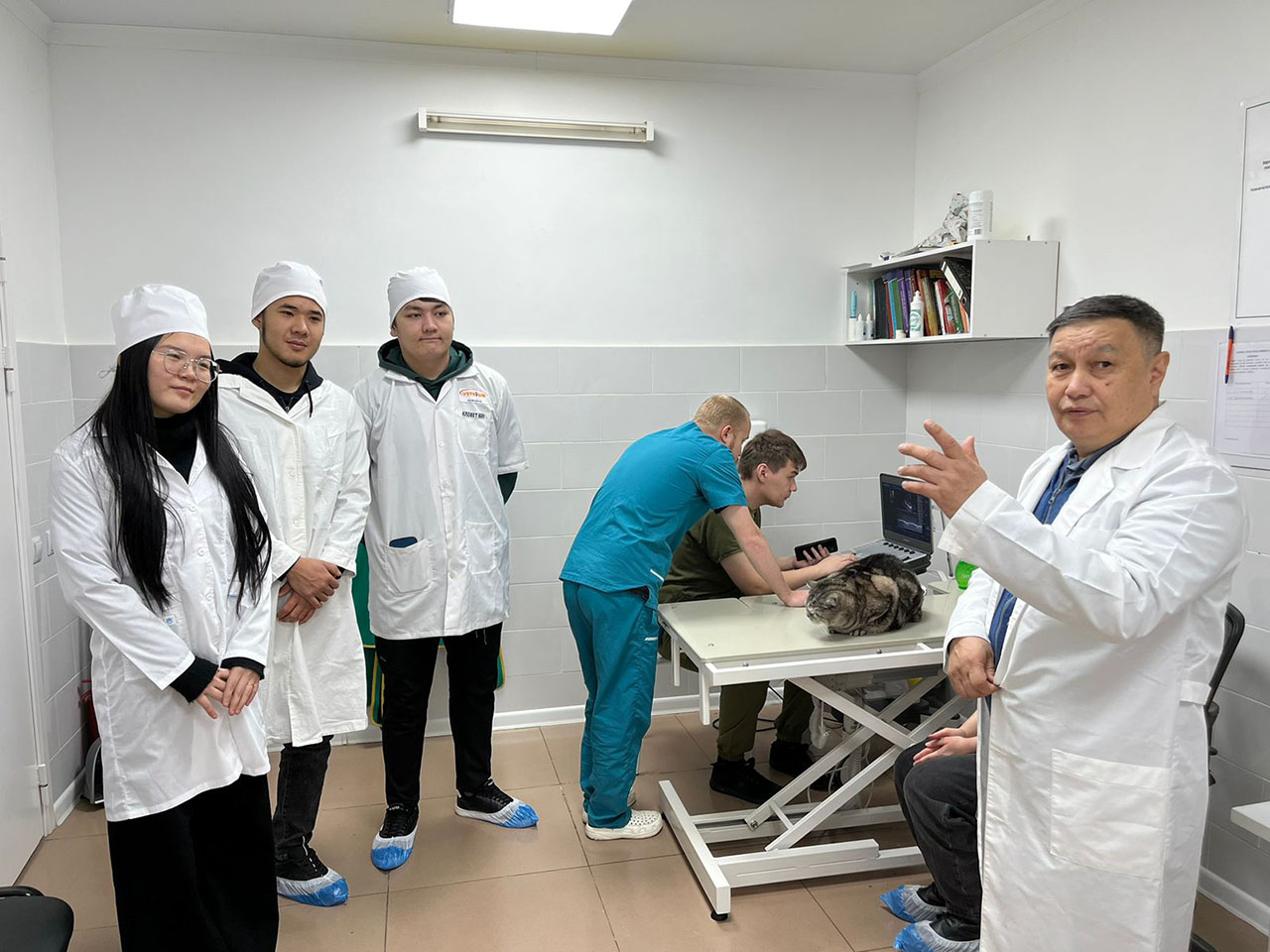 Бұл жағдайда сабақ барысында біз мысықтың зәр шығару жүйесін ультрадыбыстық аппаратпен тексеріп, бүйрек түтіктері мен қан тамырларының патологиясына зерттеу жүргізілді. Әрі қарай әрбір студент емхананың ветеринар дәрігері Владислав Александрович Дудиннің жетекшілігімен сол және оң жақ бүйректің компьютерлік суреттерін оқып, ультрадыбыстық аппараттың көмегімен дәл диагноз қойыды: Гломерулонефрит – қанды сүзетін шумақтар – шумақтарды қамтитын бүйректің қабынуы. Сондай-ақ практика-бағытталған сабақта студенттер мысықтарға арналған термометрия, әртүрлі патологияларды зертханалық диагностикалау әдістері және т.б. практикалық дағдыларды меңгерді. Қорытындылай келе, ветеринарлық клиникаларда шағын топтарда оқу үдерісін ұйымдастыру арқылы талқылап, студенттерге материалды түсініп нақтылауға мүмкіндік беріп, қатысушыларға өз ойларын айтуға ықпалын тигізеді және практикалық дағдыларды жетілдіреді.