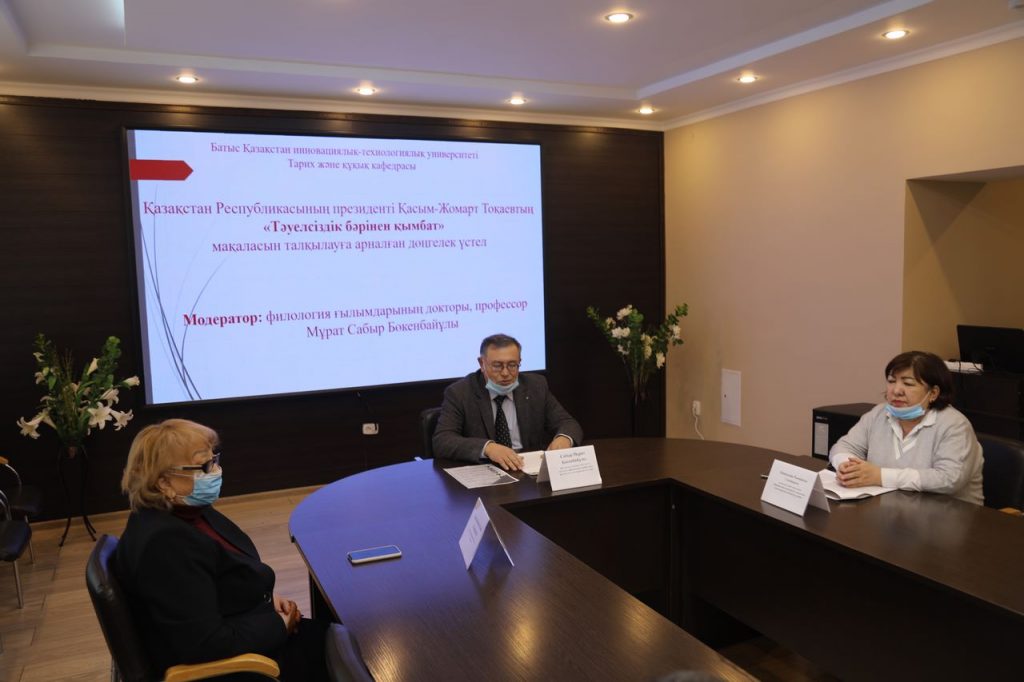 2021 жылы 20 қаңтарда Педагогикалық факультеті Тарих және құқық кафедрасының ұйымдастыруымен Қазақстан Республикасының президенті Қасым-Жомарт Тоқаевтың «Тәуелсіздік-бәрінен қымбат» мақаласын талқылауға арналған дөңгелек үстел өткізілді. Дөңгелек үстелге Батыс Қазақстан инновациялық-технологиялық университетінің ғалымдары Құрманалин Самат Бақытжанұлы, Калменов Мурат Дабылұлы, Мұрат Сабыр Бөкенбайұлы, Бегилов Талгат Зауырұлы, Қайыров Асан Бақиұлы, Кинжекова Рысқаным Сәлімқызы, Мамыров Азамат Ыбырайұлы қатысты.