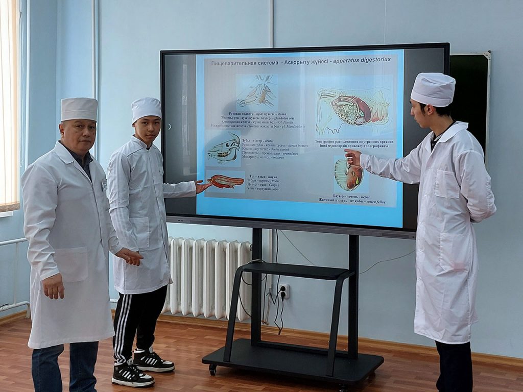 «Жануарлар морфологиясы» пәні бойынша оқу бағдарламасының (силлабус) бекітілген жоспарына сәйкес 6В09103 1 курс «Ветеринария» мамандығы Салалық технологиялар институтының ВЕТ-11О және ВЕТ-12О топтары студенттеріне 2024 жылғы 14 наурызда сағат 12.00-де «Ветеринария және техносфера қауіпсіздігі» кафедрасынын ветеринарлық клиникада келесі профессорлық-оқытушылық құрамының қатысуымен дөңгелек үстел өтті – қауымд. профессор в.ғ.к. А.К. Днекешев, және аға оқытушы Б.О. Шотов. «Ауыл шаруашылығы жануарларының аталық және аналық несеп-жыныс мүшелерінің құрылысымен ас қорыту жүйесінің анатомиясы» тақырыбында дөңгелек үстелде аралық бақылауды тапсыру бойынша интерактивті сабақ латын терминологиясын қолдана отырып, қазақ және орыс тілдерінде жүргізілді. Педагогикалық зерттеудің мақсатына сәйкес 6В09103 – Ветеринария бағыты бойынша 1 курс студенттеріне «Жануарлар морфологиясы» пәнінен аралық бақылауды ұйымдастыруда инновациялық педагогикалық тәсілді қолдану үлгісі жасалды. Осы мақсатқа жету үшін келесі міндеттер жүктелді: «Жануарлар морфологиясы» пәні бойынша аралық бақылауды тапсыру кезінде қолдану қажет және орынды болатын білімді бақылаудың интерактивті жаңа әдісі туралы түсінік беру; 6В09103 – Ветеринария мамандығының 1 курс студенттері үшін кәсібиліктің бірінші тәсілінің элементтерімен құзыреттілік түріндегі аралық бақылауды ұйымдастырудың инновациялық нұсқасын әзірлеу.