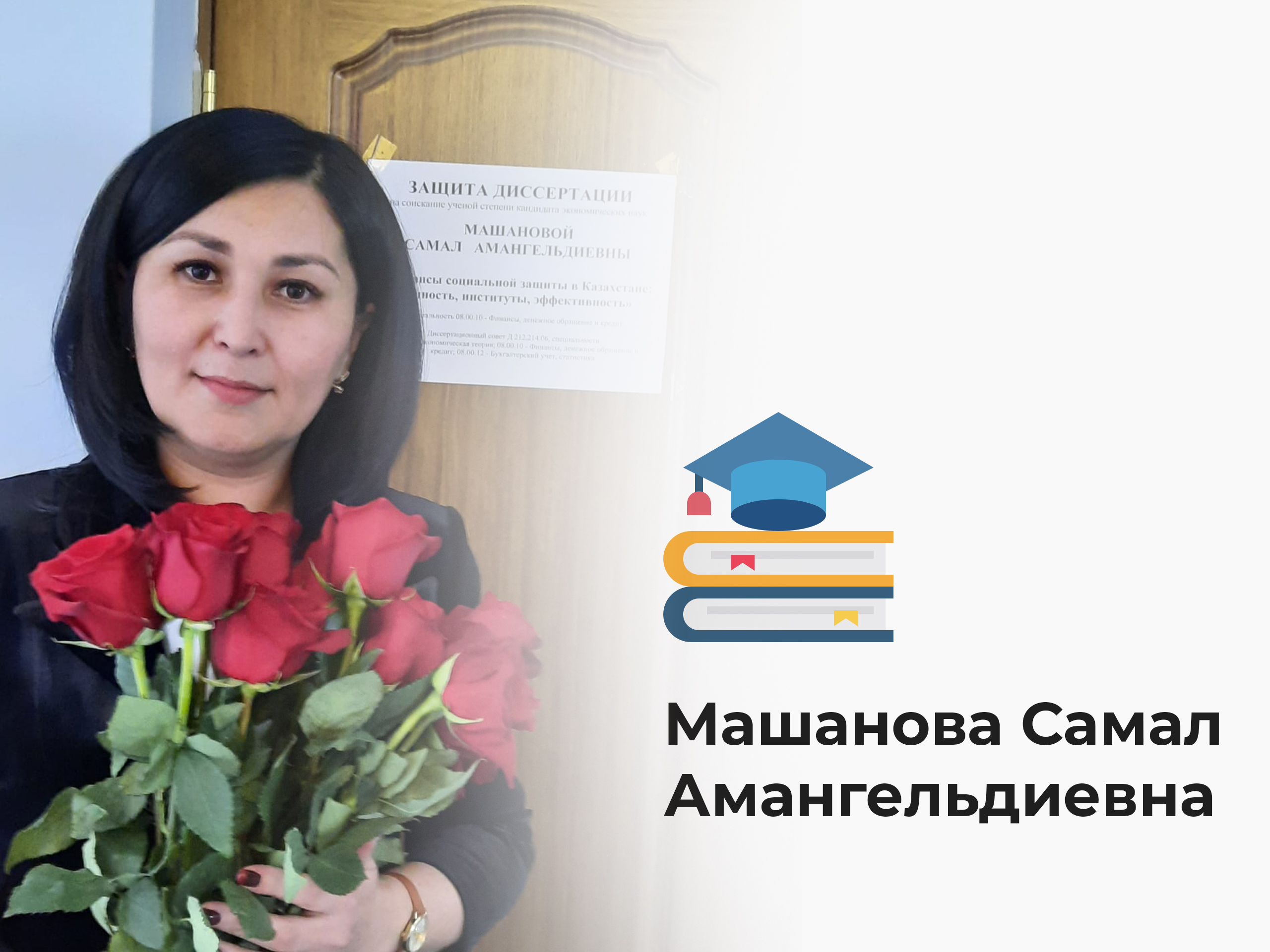 2022 жылдың 31 мамырында университетіміздің Академиялық қызмет департаментінің басшысы, магистр Машанова Самал Амангелдиевна Самар мемлекеттік экономикалық университетінің жанындағы Д 212.214.06 диссертациялық кеңесінде 08.00.10 – Қаржы, ақша айналымы және несие мамандығы бойынша кандидаттық ғылыми дәрежесін алу мақсатында «Финансы социальной защиты в Казахстане: сущность, институты, эффективность» атты тақырыбында кандидаттық диссертациясын сәтті қорғады.
