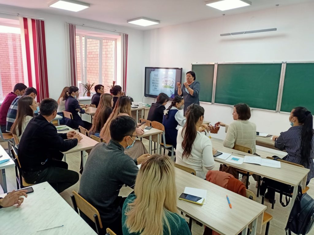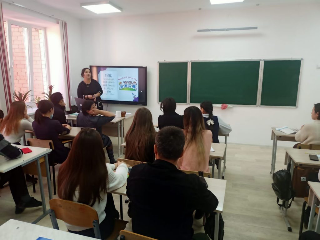 11.11.21ж. №38 Ә.Молдағұлова атындағы мектеп-лицейінде “Дуалды оқыту жүйесін жүзеге асыру” мақсатында кафедраның аға оқытушысы А.Х. Утебаева және мұғалім-практик А.А.Салаватованың жетекшілігімен өткізілген “Шет тілі және аударма ісі” кафедрасының “Шетел тілі: екі шетел тілі” мамандығының 4 курс студенттерімен мектептің 10 сынып оқушылары қатысқан дебат-сабақ өтті. Сабақ басында ағылшын тілі пәні мұғалімі, педагог-зерттеуші, педагогика ғылымдарының магистрі А.А. Салаватова үш тілде сөйлеп, сабақ ұйымдастырды. Студенттермен «One adjective» танысу тренинг өткізіп, №38 Ә.Молдағұлова атындағы мектеп-лицейінің оқу-әдістемелік жұмыстары және жетістіктері жөнінде мағлұмат беріп, болашақ ұстаздарға шет тілін оқуға қажет сайттармен бөлісті. «SMS» feedback жүргізу арқылы болашақта өздерінің кері байланыстарында практикаға бағдарланған форматын атап көрсетіп, мектеп мұғалімдеріне кәсібилік және ынтымақтастық атмосфера үшін алғыстарын жеткізді. Әрі қарай, аға оқытушы А.Х. Утебаева педагогикалық шеберлігін көрсетіп, тәжірибені жақсарту бойынша өзі дайындаған үлгілі сабағын ұсынды. Студентер талдау жасауға, «Сөйлемді аяқта…» әдісімен тілдік дағдыны дамыту аспектілерін айқындауға, сөйлеу тілінің граматикасын қалыптастыруда «Teaching with limited Resource» диалогтік сөздің қалыптастыруға, түсінгенін айта білуге үйренді. Сабақтағы қалыптастырушы бағалау мен оның ажырамас бөлігі – мұғалімнің кері байланысын білікті ұсыну қажеттігін атап көрсетті.