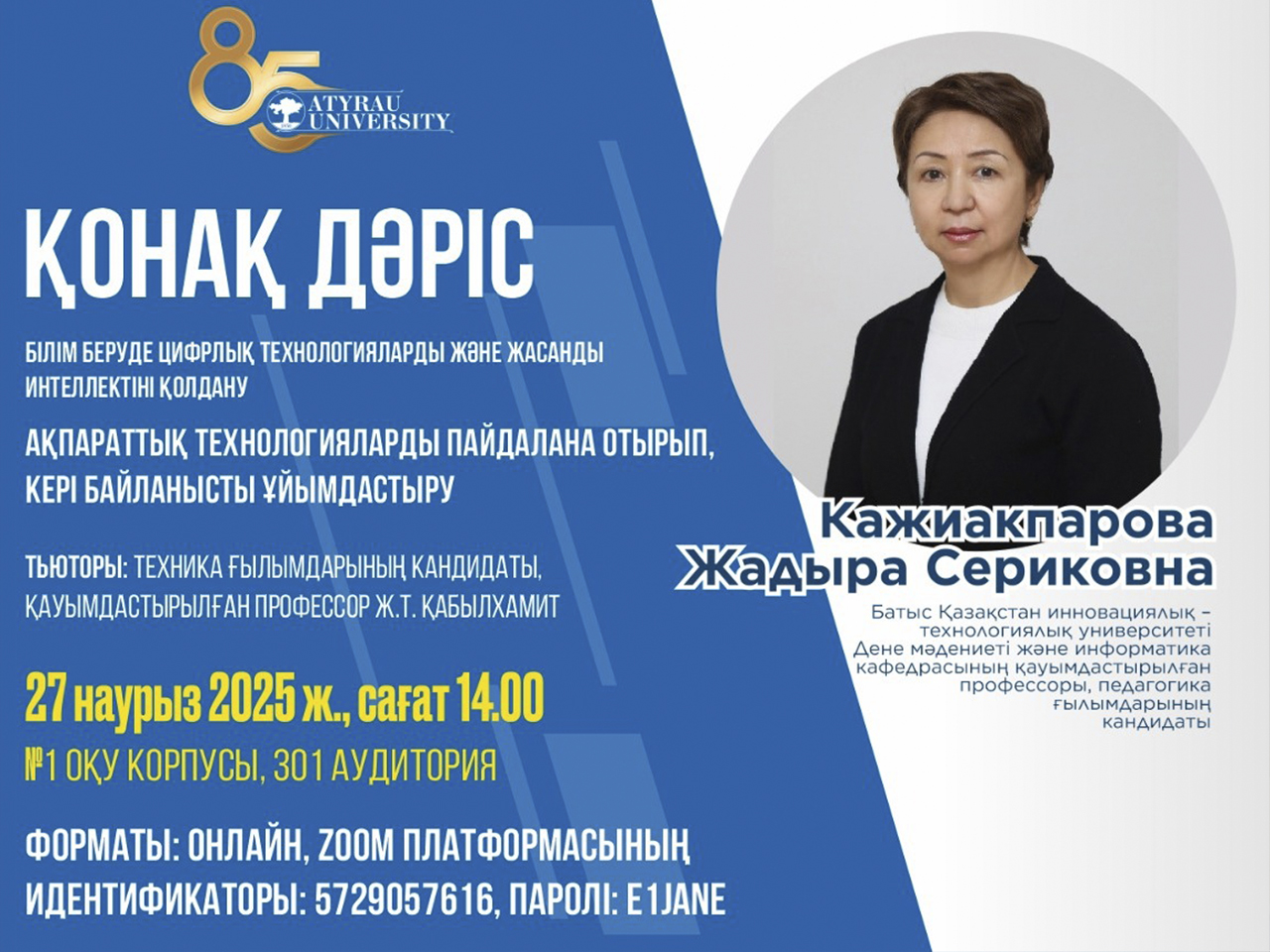 2025 жылдың 27 наурызында Х.Досмұхамедов атындағы Атырау университетінің «Физика, математика және ақпараттық технологиялар» факультетінде Педагогикалық мамандықтардың 2-курс білім алушылары үшін «Білім беруде сандық технологияларды және жасанды интеллектіні қолдану» пәні аясында қонақ дәріс ұйымдастырылды.