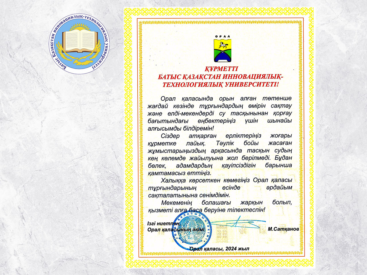 Өткен аптада Батыс Қазақстан инновациялық-технологиялық университеті Орал қаласының әкімі М.М. Саткановтан “Университеттің халықтың өмірін сақтап қалуға және Орал қаласындағы төтенше жағдай кезінде елді мекендерді су тасқынынан қорғауға сіңірген еңбегі үшін”алғыс білдірді.