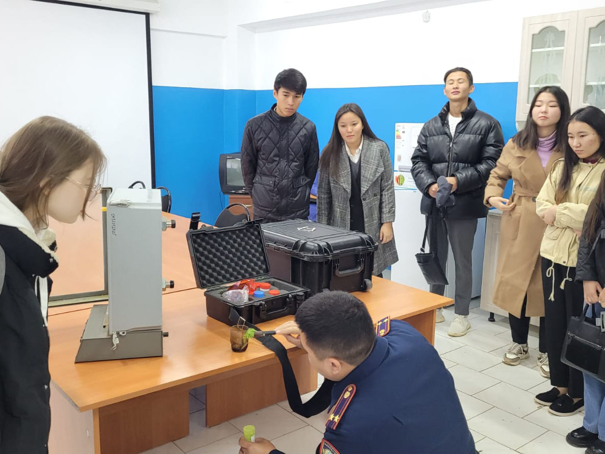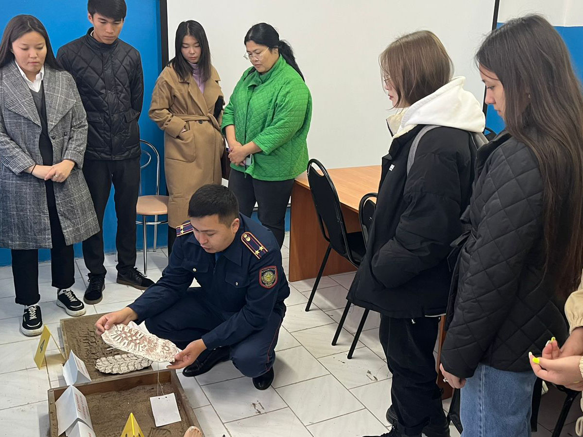 Полиция департаменті жедел криминалистикалық басқармасының бас криминалисі полиция подполковнигі Жұсупов Қосым Қаналыұлы трасологиялық іздерді алу сияқты әдістері сияқты мәселелеріне практикалық білім берді. Студенттерге криминалистикалық жиынтық көрсетіліп, басып шығаруға арналған құралдар мен заттарға толық сипаттама берілді.