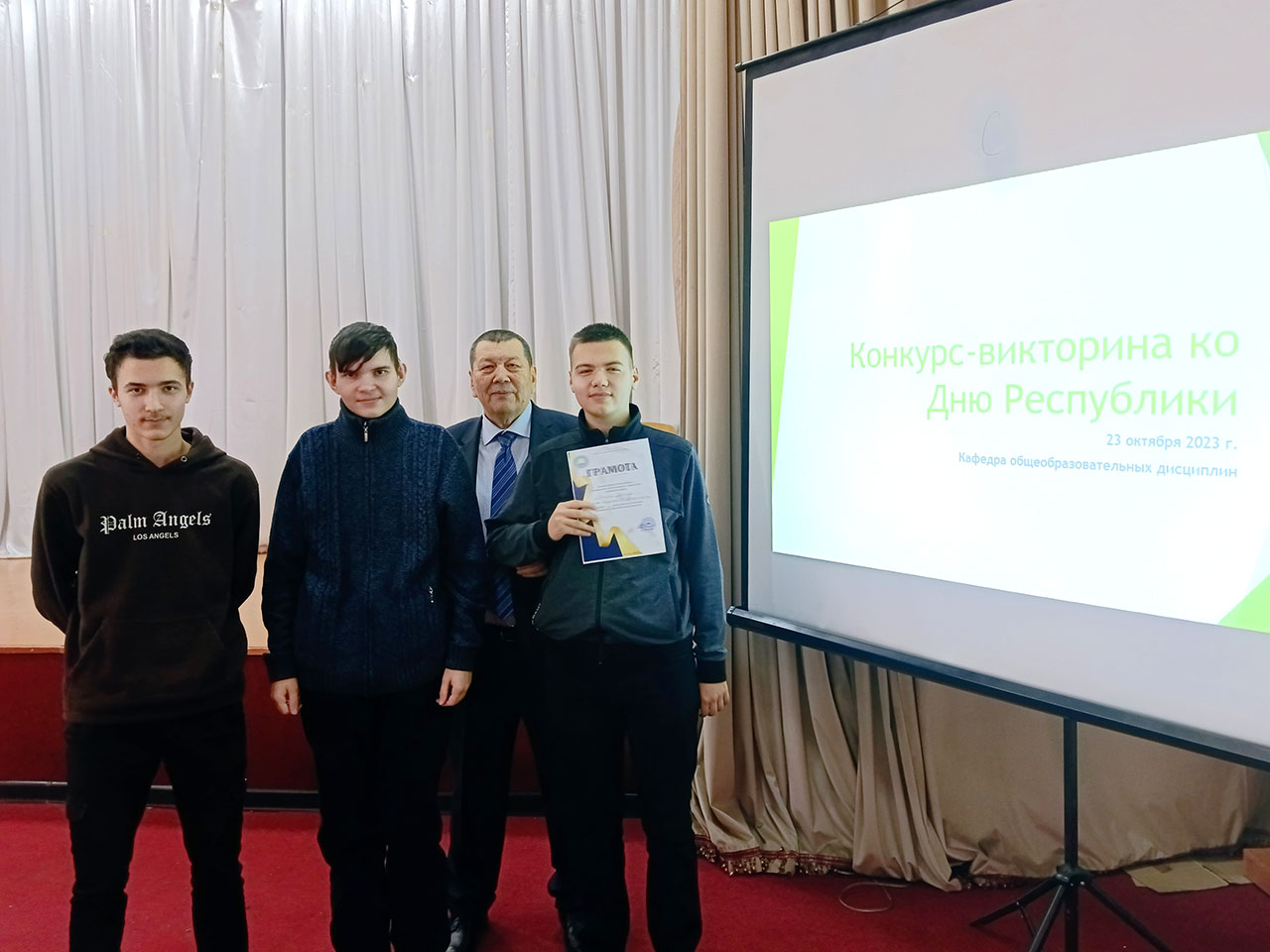 2023 жылдың 23-24 қазанында жалпы білім беретін пәндер кафедрасының профессоры Қадырғалиев Н.М. Республика күніне арналған ЗКИТУ индустриалды технологиялар институтында 1 курс студенттері арасында Қазақстан тарихы бойынша викториналық сайыс ұйымдастырылып, өткізілді.