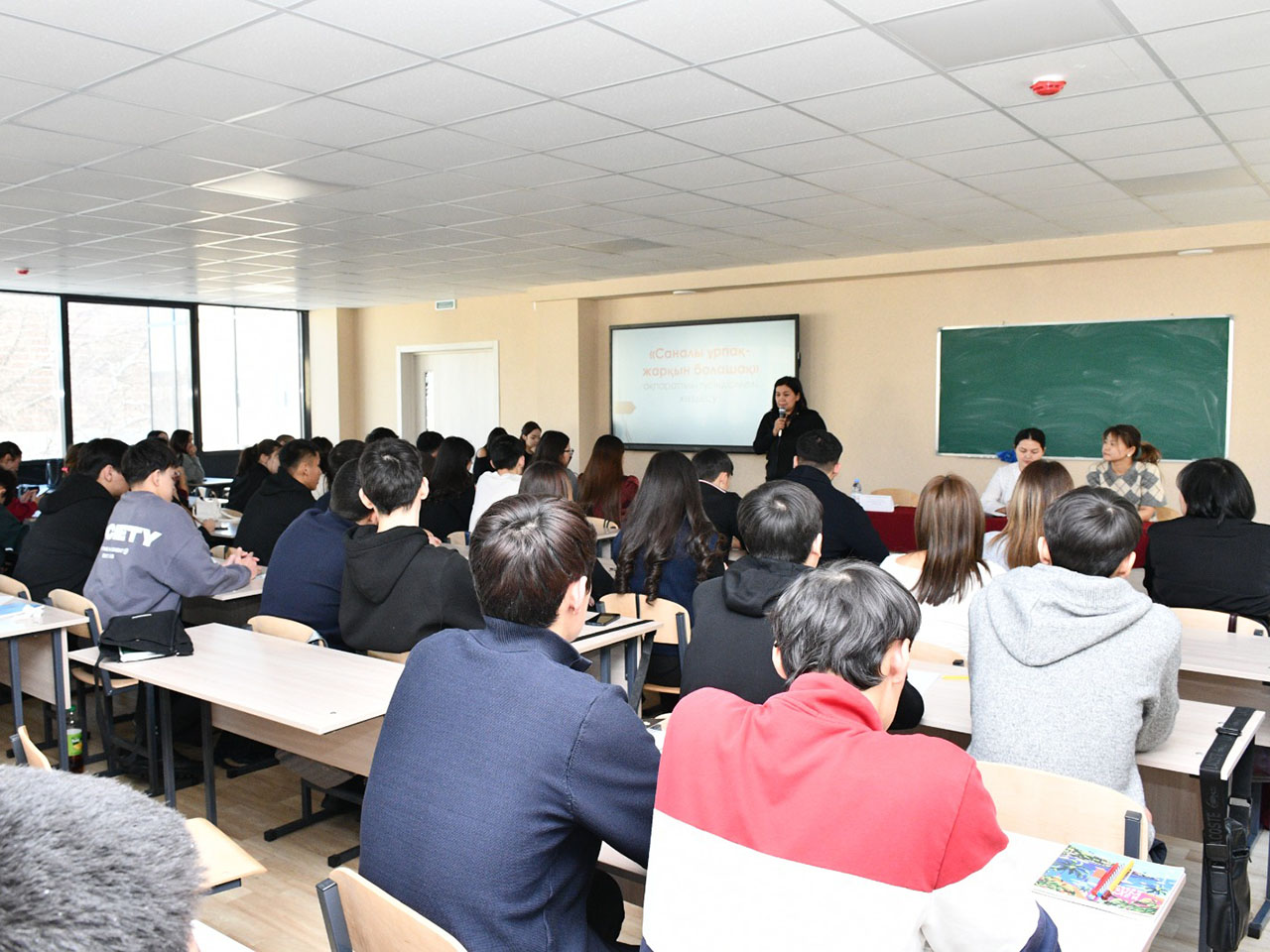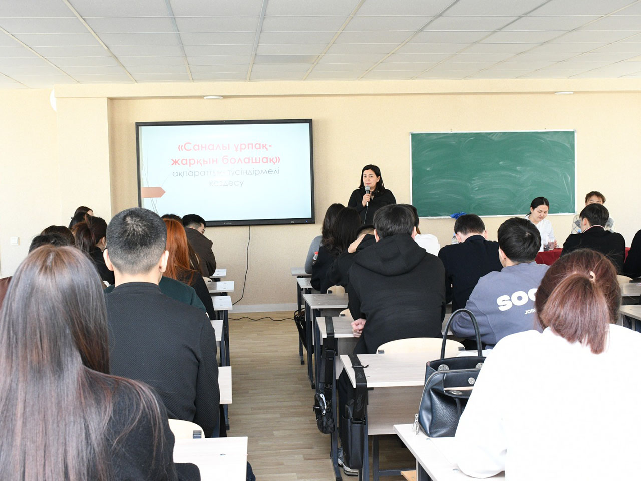 2026 жылдың 10-11 ақпан айында Жалпы білім беру пәндер кафедрасының аға оқытушы, психолог Ф.Ж Разахова институтымыздың 1-курс студенттеріне «Саналы ұрпақ – жарқын болашақ» атты ақпараттық – түсіндірмелі кездесу өткізді. Кездесуге салауатты өмір салты дәрігеріС.С.Насырова, психолог З.А. Құсайынова, акушер гинеколог Н.А Атабаева, терапевт У.М. Мендыгалиева, СТИ медицина қызметкерлері Ж.К, Саймаганбетова мен С.В Беляеева қатысты. Кездесудің мақсаты: студенттерге бейімделу кезіндегі студенттерге психологиялық көмек көрсету, жастардың репродуктивтік денсаулығын сақтау, электронды темекі мен энергетикалық сусындардың алдын алу, жыныстық жолмен берілетін инфекциялардың алдын алу туралы кеңінен түсінік беру. Шара ақпараттық- танымдық бағытта өтті. Студенттер тарапынан толғандырған сұрақтар қойылып, жауаптары алынды. Білім алушылар арасында психологиялық сұрақтар туындаған жағдайда факультеттің жауапты мамандарына жүгінуге болатынын және жедел байланыс номерлері берілді.