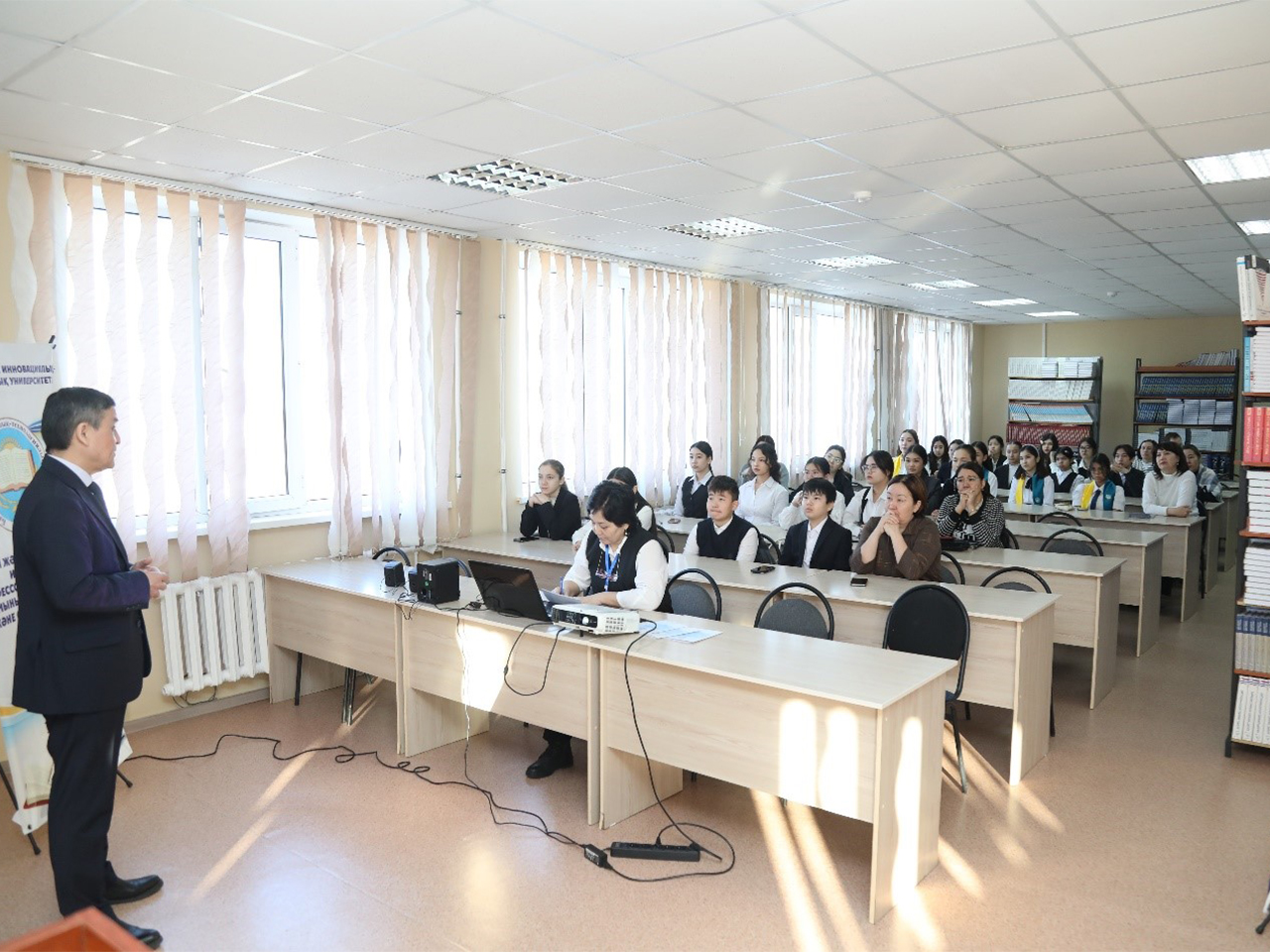 А.А. Абдульманов, ф.ғ.к., қауымдастырылған профессор оқушыларды Батыс Қазақстан инновациялық-технологиялық университетімен таныстырып, экскурсия өткізді. Оқушыларға заманауи талаптарға сәйкес келетін сұранысқа ие мамандықтар туралы айтып берді, сондай-ақ бакалавриат және магистратура институтының білім беру бағдарламалары туралы ақпарат берді.
