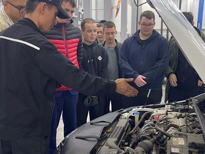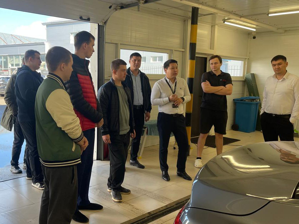 Экскурсия барысында білім алушыларға автокөліктердің құрылысы, қызмет көрсету технологиялары, жаңа экологиялық стандарттар мен қауіпсіздік жүйелері туралы мәліметті орталықтың директоры Рустам Хайруллаевич жан-жақты айтып берді. Автокөліктерге техникалық қызмет көрсету барысында диагностикалық жарықтандыруды қолданудың маңызын атап өтті. Оның айтуынша, заманауи жарықтандыру жүйесі көрнекі бақылаудың дәлдігін арттырып, диагностиканың сапасын және қызметкерлердің еңбек қауіпсіздігін қамтамасыз етеді.