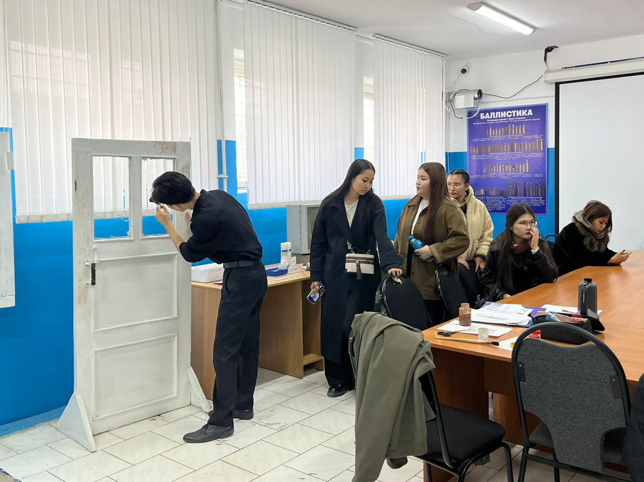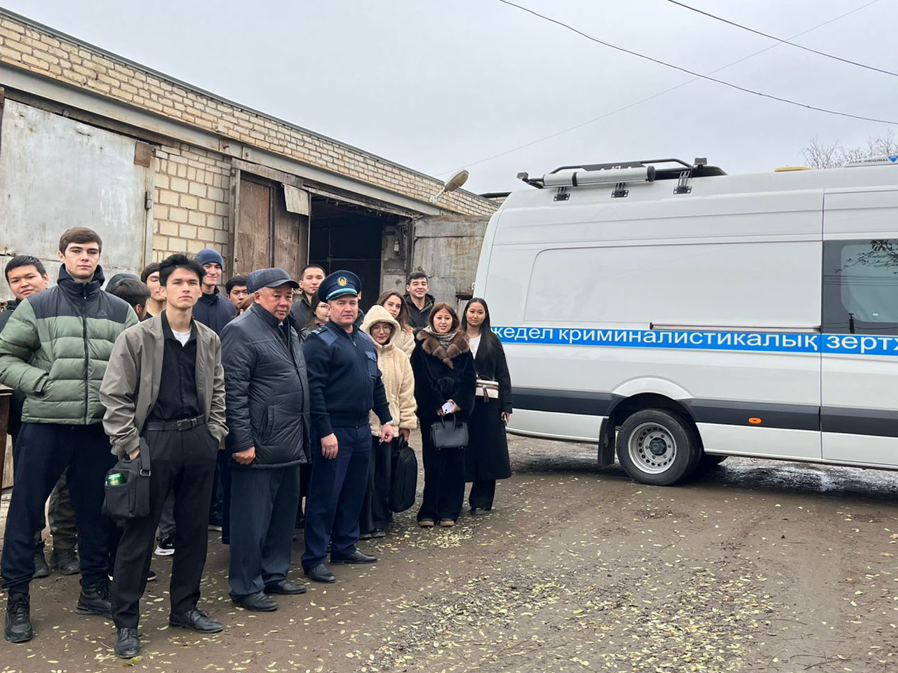 Аға криминалист Сарсекенов Болатбек Аскербекұлы студенттерге жылжымалы криминалистикалық зертхананың құрылымы мен техникалық жабдықталуын таныстырып, ауыр қылмыстар орын алған жерлерге шығу кезінде, оның тәжірибелік қолданылу мүмкіндіктерін көрсетіп, сабаққа қатысушылардың барлық сұрақтарына жауап берді.