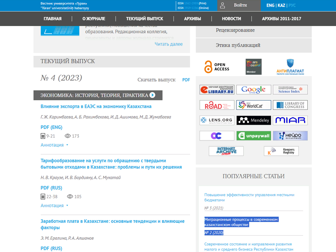БҚИТУ “Бизнес және басқару” білім бағытындағы «Қаржы және экономика» кафедрасының жетекші ғалымдары жарияланым қызметін белсенді жүргізіп келеді. Соңғы 5 жылда жарияланға мақалалар қатарында: