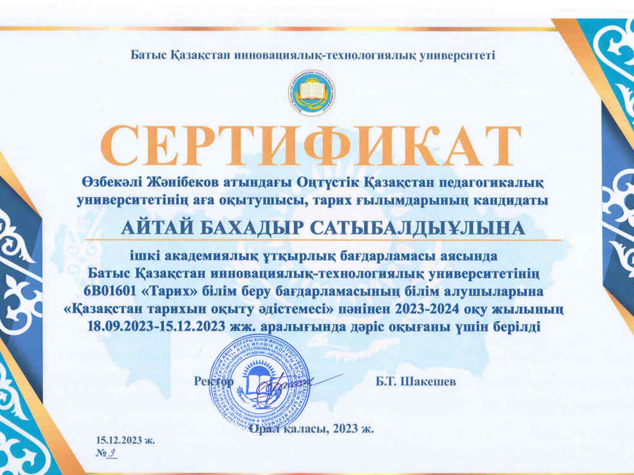 2023-2024 оқу жылының бірінші жартысында Батыс Қазақстан инновациялық-технологиялық университеті «6В01601-Тарих мұғалімін даярлау» білім беру бағдарламасының білім алушыларына «Тарихты оқыту әдістемесі» пәнінен Өзбекәлі Жәнібеков атындағы Оңтүстік Қазақстан педагогикалық университетінің аға оқытушысы, тарих ғылымдарының кандидаты Айтай Бахадыр Сатыбалдыұлы ішкі академиялық ұтқырлық бағдарламасы аясында 2023 жылдың 18 қыркүйек – 15 желтоқсан аралығында дәріс оқыды. Академиялық ұтқырлық бағдарламасы нәтижесінде оқытушыға Батыс Қазақстан инновациялық-технологиялық университетінің ректоры, қауымдастырылған профессор Б.Т.Шакешевтың сертификаты табысталды. Өзбекәлі Жәнібеков атындағы Оңтүстік Қазақстан педагогикалық университетімен арадағы ынтымақтастық туралы келісім-шарт негізінде бірлескен ғылыми жобалар орындау, халықаралық конференциялар ұйымдастыру, академиялық ұтқырлық бағдарламасын жүзеге асыру бойынша жұмыстарды жалғастыру көзделеді.