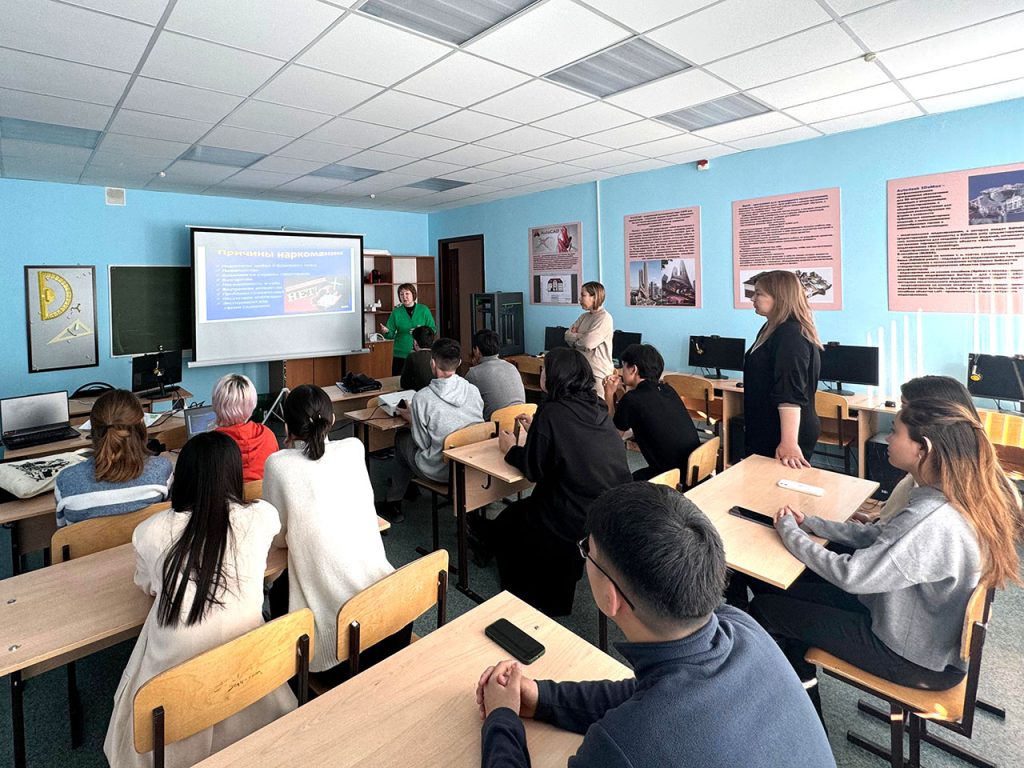 Іс-шара барысында есірткі құралдарының түрлері, есірткіні қабылдау себептері және олардың зиянды салдары туралы бейнефильм мен презентациялар қаралды. Білім алушылар қазіргі жастар арасында нашақорлық мәселелерін белсенді талқылады.