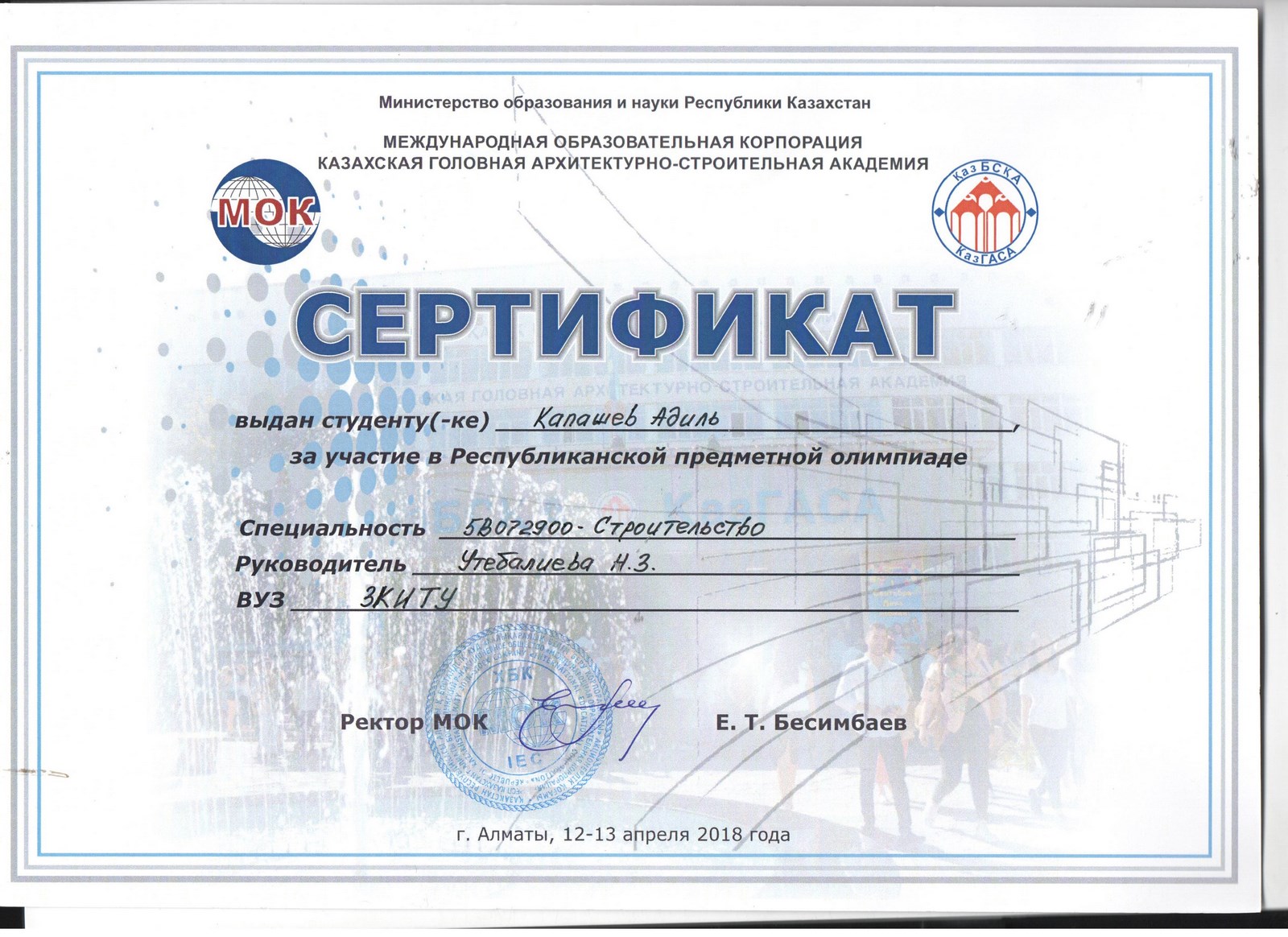 Олимпиада қорытындысы бойынша «Геотехника I» пәнінен Сактаганова Анель жүлделі II орын иеленіп, дипломмен марапатталды және «Құрылыс конструкциясы I» пәнінен Капашев Адильге сертификат ұсынылды.