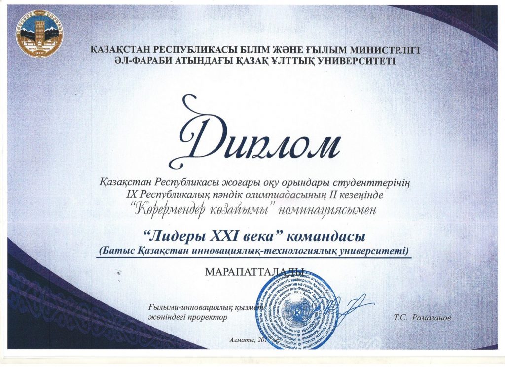 2017 жылдың 31 наурызында Әл-Фараби атындағы Қазақ ұлттық университетінде Қазақстан Республикасы жоғарғы оқу орындары студенттерінің арасындағы 5В051000- Мемлекеттік және жергілікті басқару мамандығы бойынша ІХ Республикалық пәндік олимпиадасының финалына Батыс Қазақстан инновациялық-технологиялық университеті Тілдер және менеджмент факультетінің «Экономика және менеджмент» кафедрасының 5В051000- Мемлекеттік және жергілікті басқару мамандығының 3 курс студенттері қатысып, «Көрермендер көзайымы» номинациясы бойынша дипломға ие болды, сонымен бірге сертификаттар тапсырылды. «Лидеры XXI века» командасын және жетекшісі Тулегенова Айнагуль Утегеновнаны құттықтаймыз!