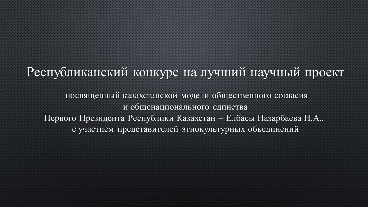 келісім мен жалпыұлттық бірліктің қазақстандық моделіне арналған үздік ғылыми жобалардың республикалық конкурсы (бұдан әрі – конкурс) Қазақстан Республикасы Үкіметінің 2019 жылғы 13 мамырдағы № 271 қаулысымен бекітілген Қазақстан халқы Ассамблеясының (2025 жылға дейінгі) даму тұжырымдамасын іске асыру жөніндегі 2019 – 2021 жылдарға арналған іс-шаралар жоспарының 49 тармағына, 2018 жылдың 12 желтоқсанында Ғылыми кеңеспен бекітілген Қазакстан Республикасы Президентінің жанындағы Мемлекеттік басқару академиясы Орталық Азия өңіріндегі этносаралық және конфессияаралық қатынастарды зерттеу орталығының білім беру және ғылыми-практикалық ic-шараларының 2019 жылға арналған жоспар-кестесіне сәйкес өткізілетін республикалық іс-шара болып табылады.